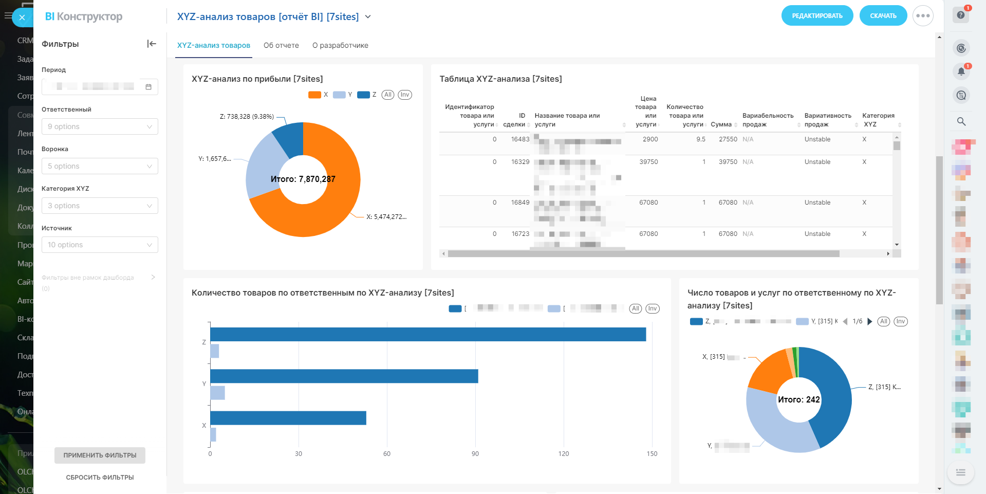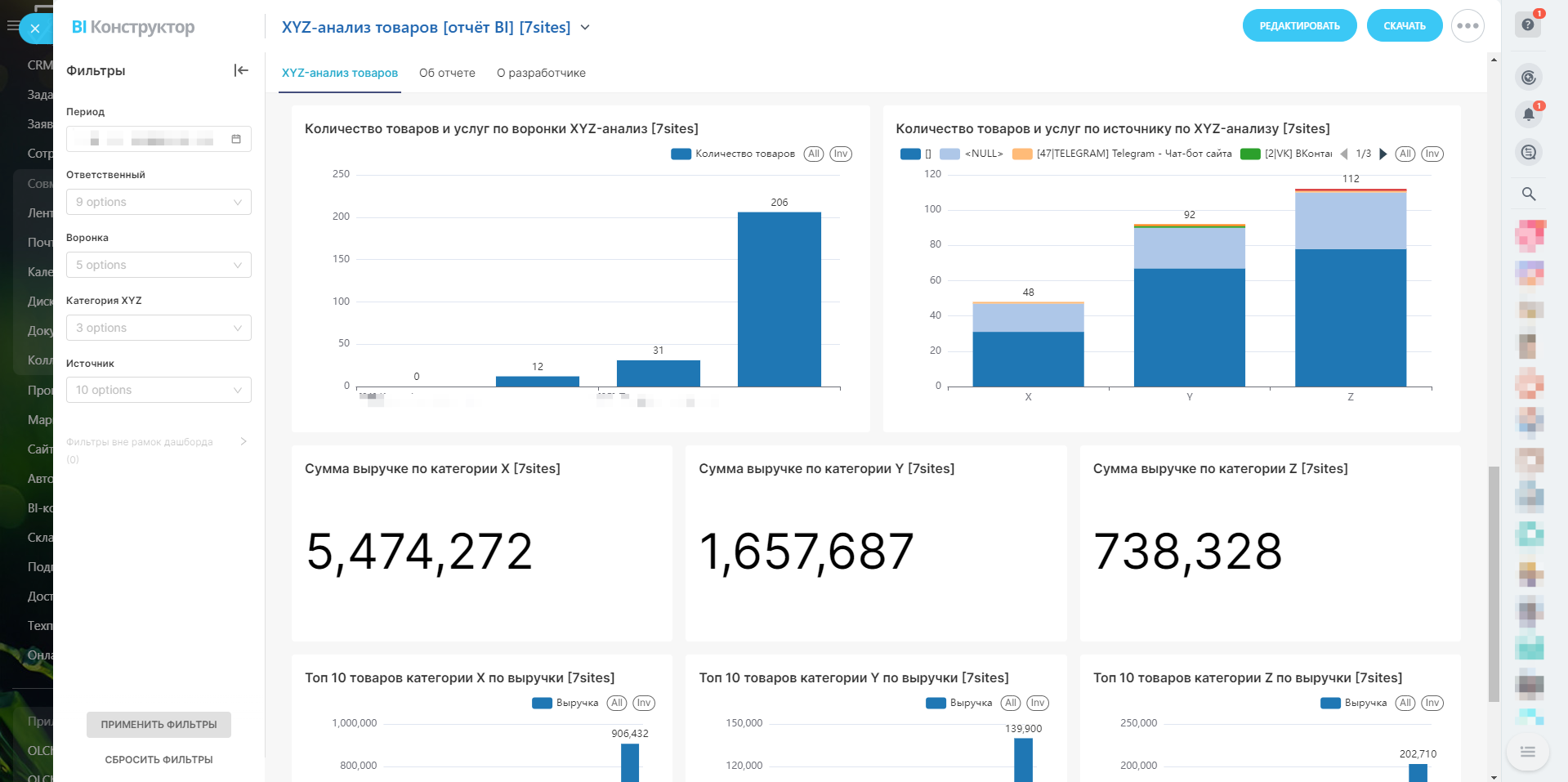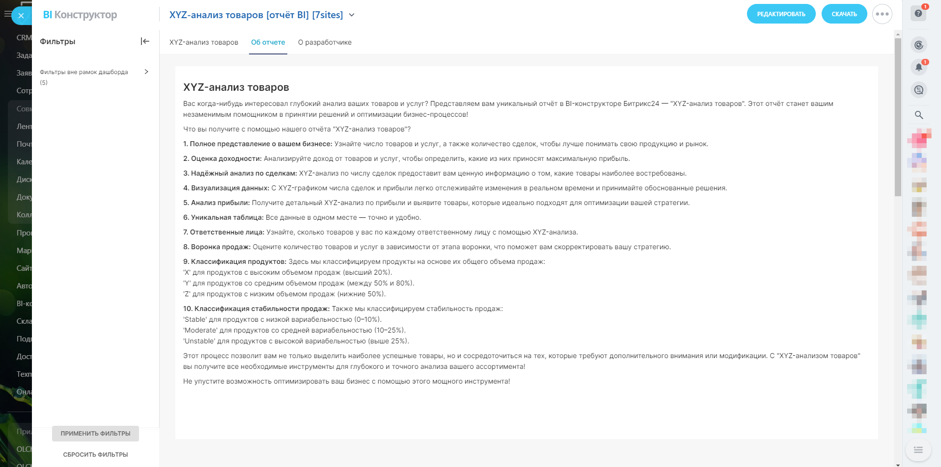 Вас когда-нибудь интересовал глубокий анализ ваших товаров и услуг? Представляем вам уникальный отчёт в BI-конструкторе Битрикс24 — "XYZ-анализ товаров". Этот отчёт станет вашим незаменимым помощником в принятии решений и оптимизации бизнес-процессов!