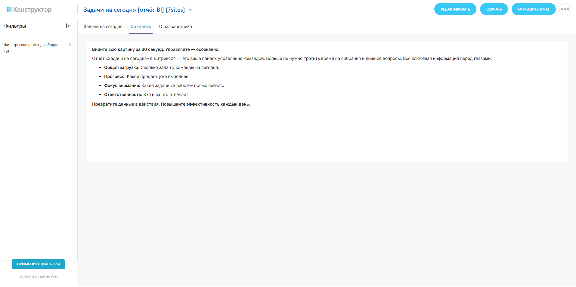 Отчёт «Задачи на сегодня» в Битрикс24 — это ваша панель управления командой. Больше не нужно тратить время на собрания и лишние вопросы. Вся ключевая информация перед глазами: