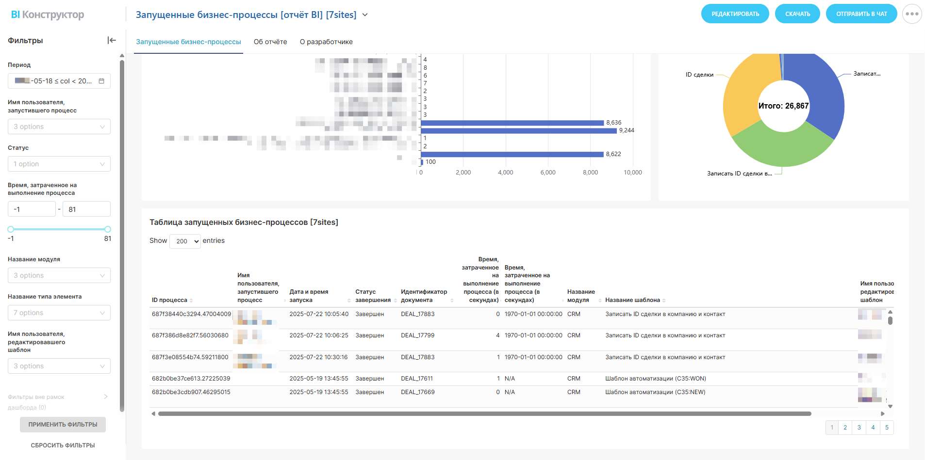 [*]Таблица запущенных бизнес-процессов. В таблице выведены следующие показатели: ID процесса: уникальный идентификатор процесса; Имя пользователя, запустившего процесс: для отслеживания активности пользователей; Дата и время запуска: момент времени, когда был инициирован процесс; Статус завершения: завершен или в процессе; Идентификатор документа: привязка к соответствующему документу; Время, затраченное на выполнение процесса (в секундах): для анализа загрузки и производительности; Название модуля и шаблона: для ранжирования и анализа использования; Имя пользователя, редактировавшего шаблон: для идентификации участников; Название типа элемента: тип бизнес-процесса для дальнейшего анализа.