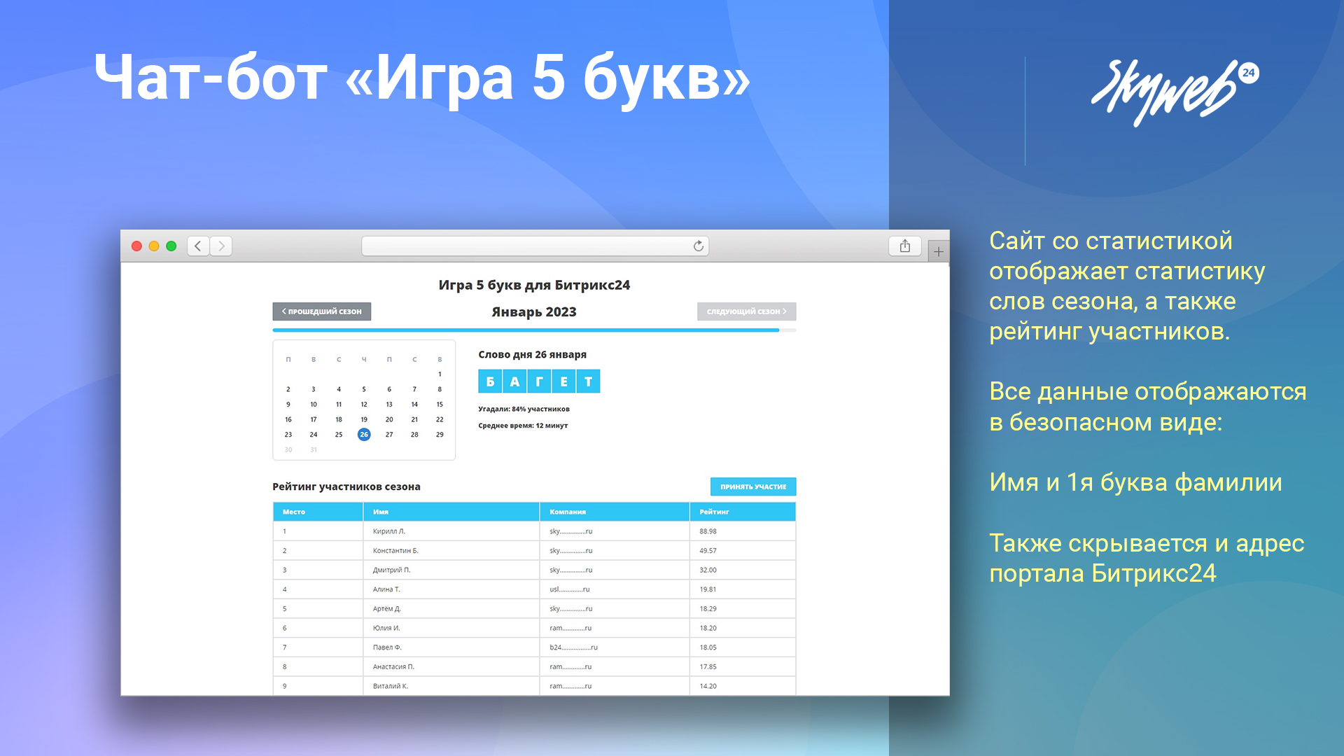 В рейтинге участников отображается только имя и первая буква фамилии, информация о портале Битрикс24 скрыта, что обеспечивает защиту данных участников.