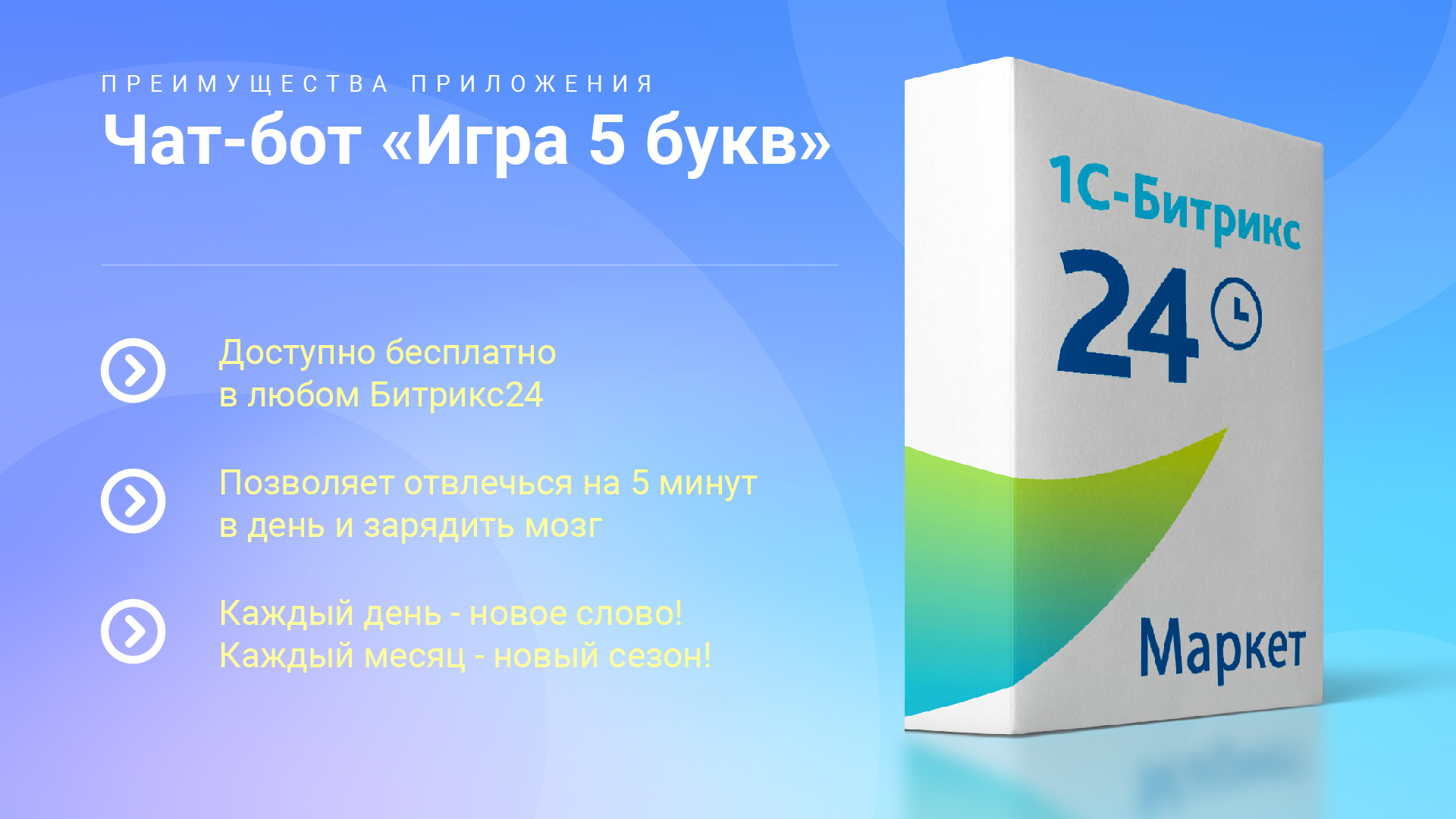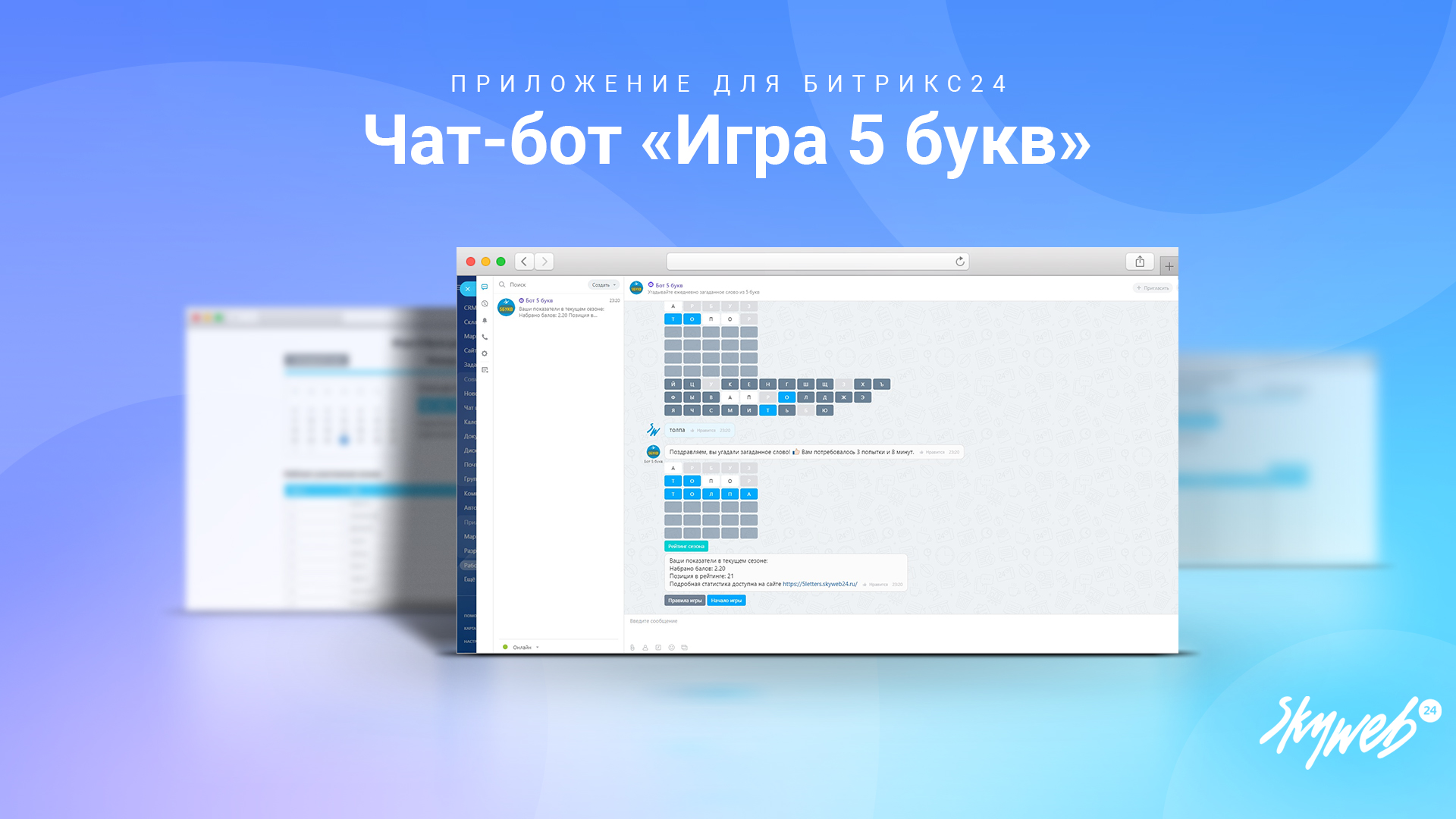 В стандартной CRM Битрикс24 нет встроенных развлекательных игр для сотрудников. "Игра 5 букв" от Скайвеб24 решает эту проблему, предлагая увлекательную и познавательную игру для тренировки мозга и улучшения логических навыков. Ежедневное обновление со словом для отгадывания помогает поддерживать интерес и стимулирует участие в межсерверных соревнованиях.