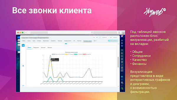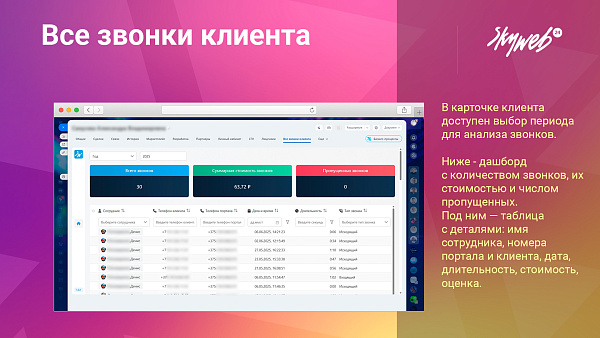 Приложение отображает детальную информацию о звонках прямо в карточке клиента — в удобном и наглядном формате с фильтрами, дашбордом, таблицей и графиками.