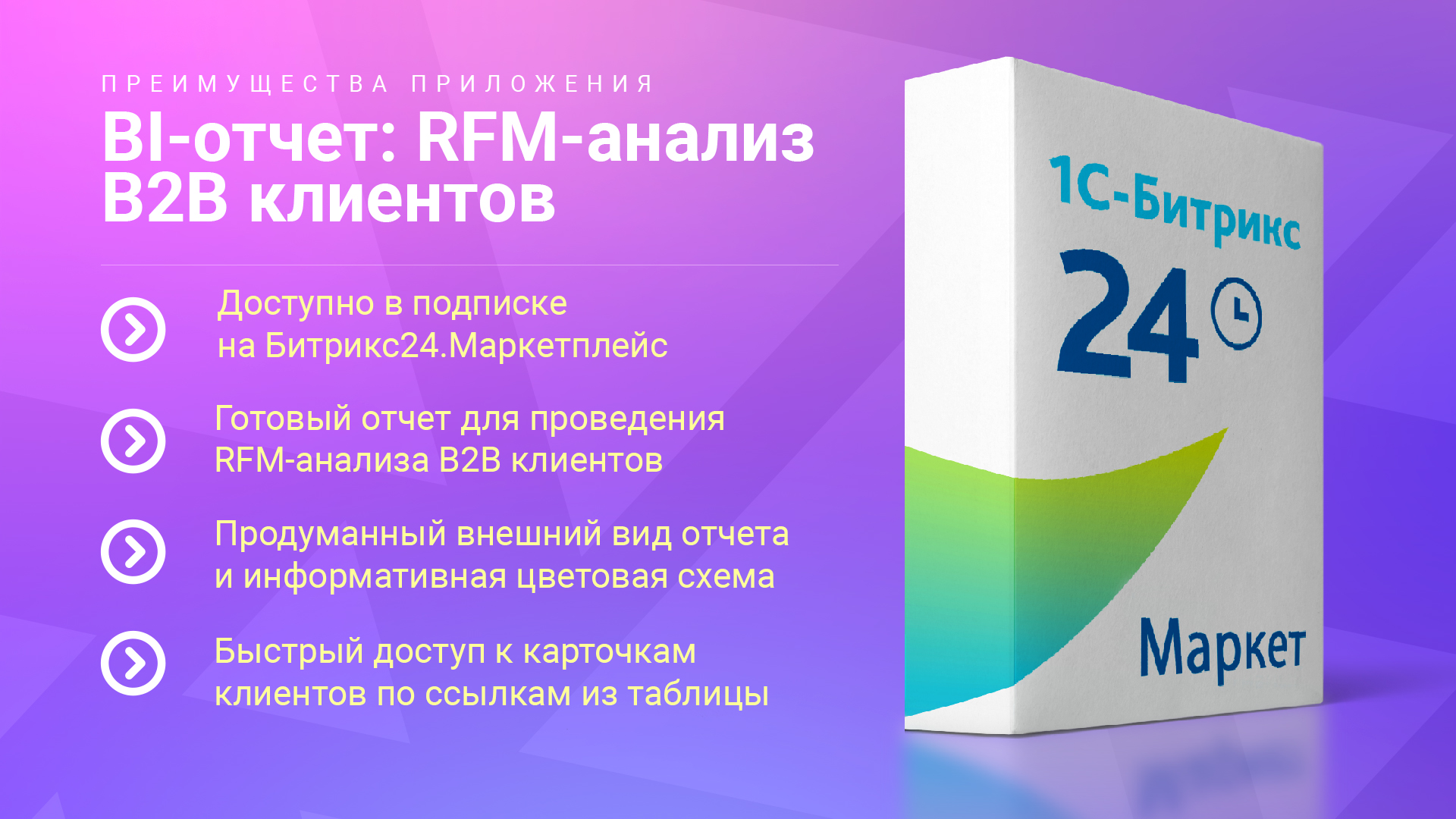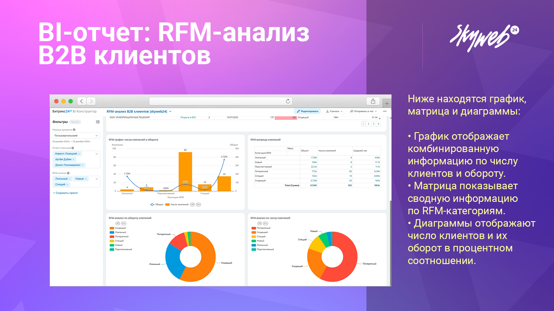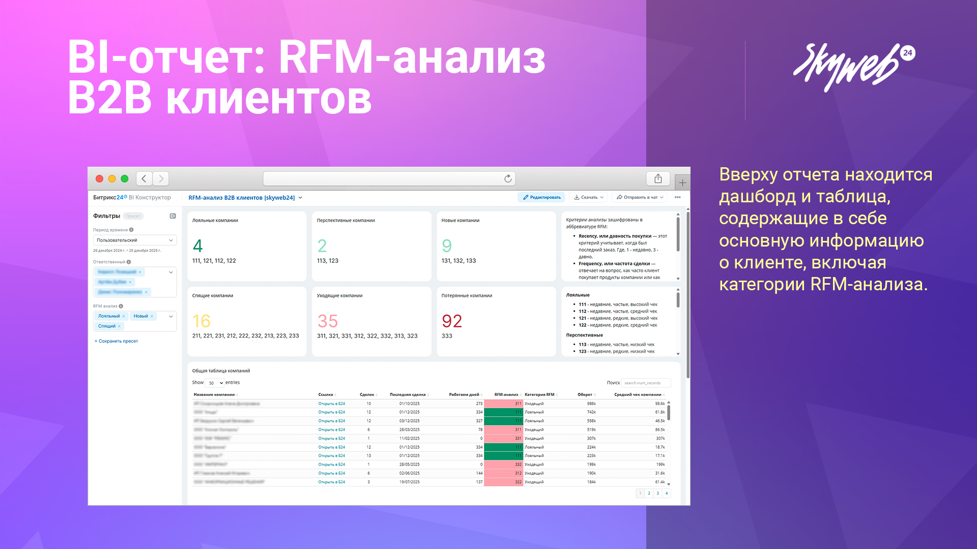 Данный отчет анализирует успешные сделки всех компаний вашей CRM и автоматически сегментирует их по категориям RFM-анализа, в зависимости от оборота, числа сделок и давности последней сделки.