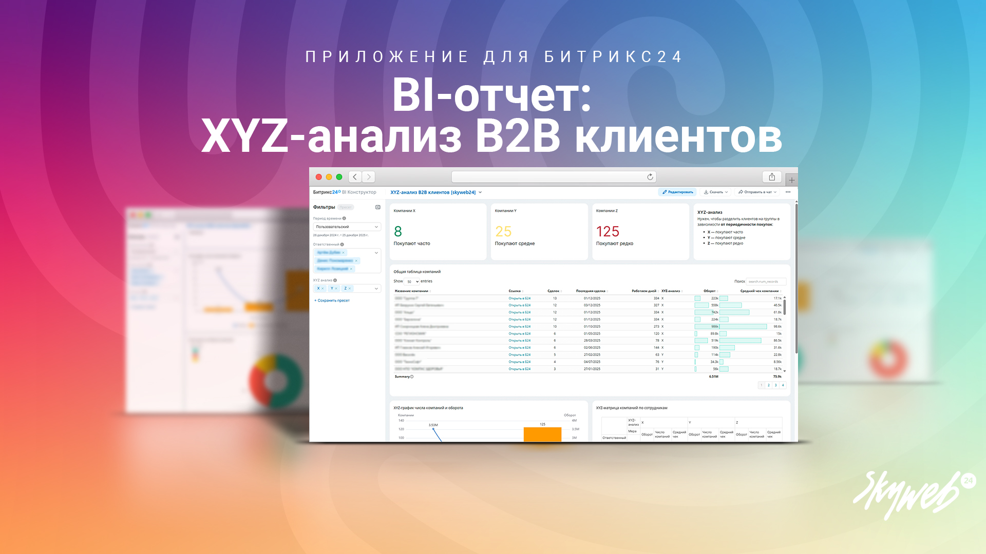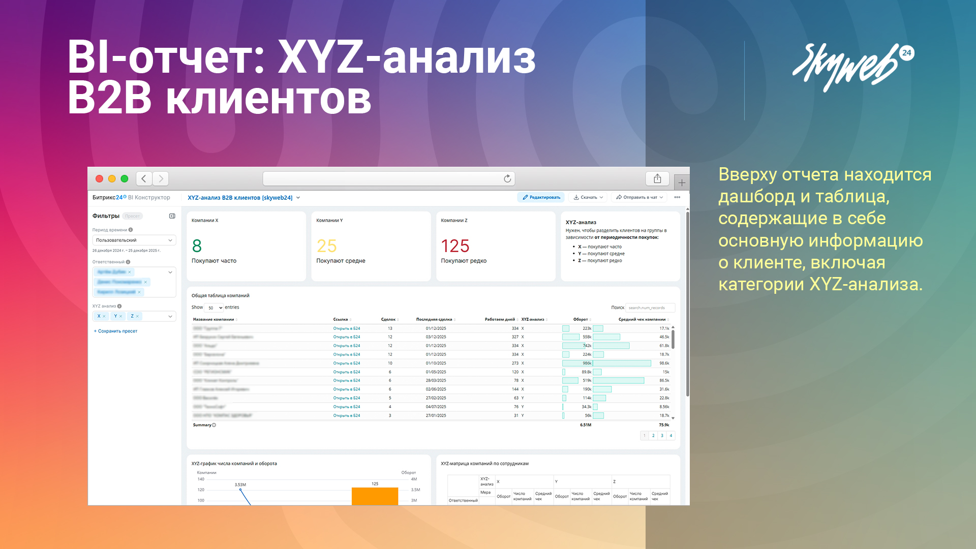 Данный отчет анализирует успешные сделки всех компаний вашей CRM и автоматически сегментирует их по категориям XYZ-анализа, в зависимости от давности последней сделки.