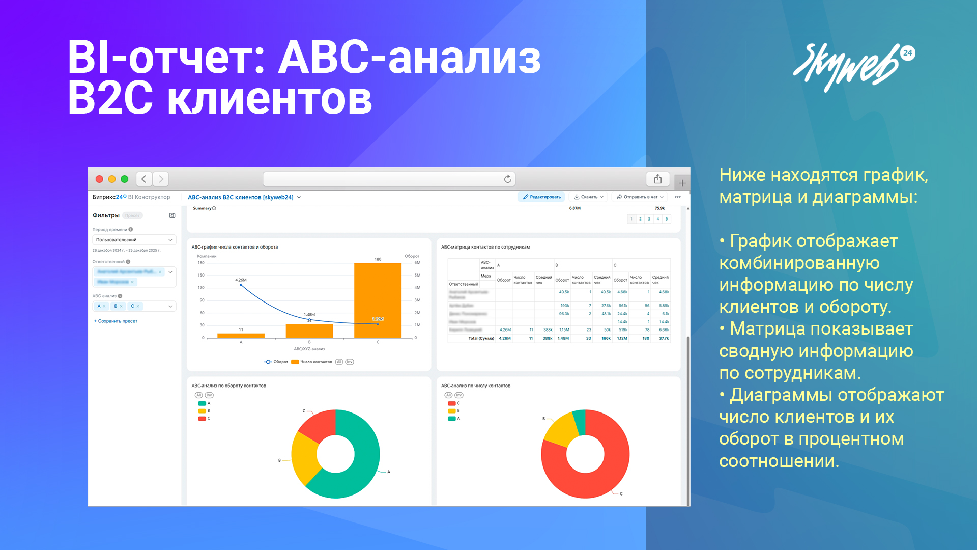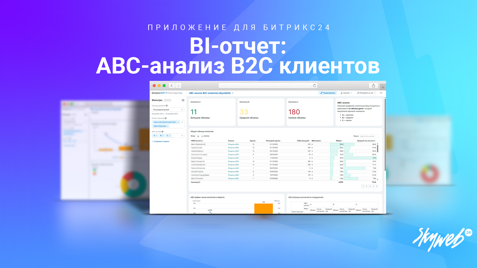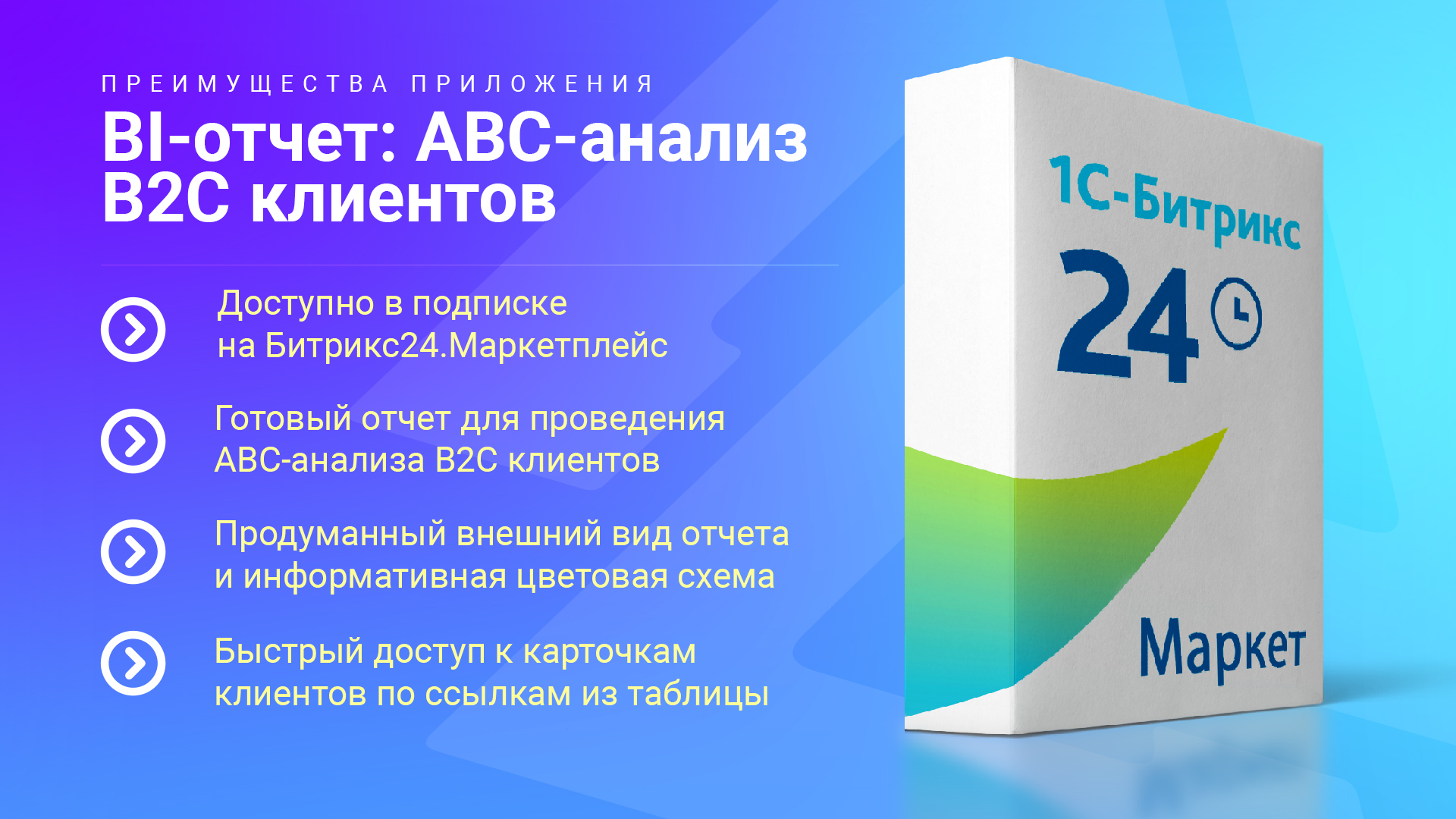 Данный отчет анализирует успешные сделки всех контактов вашей CRM и автоматически сегментирует их по категориям ABC-анализа, в зависимости от оборота.