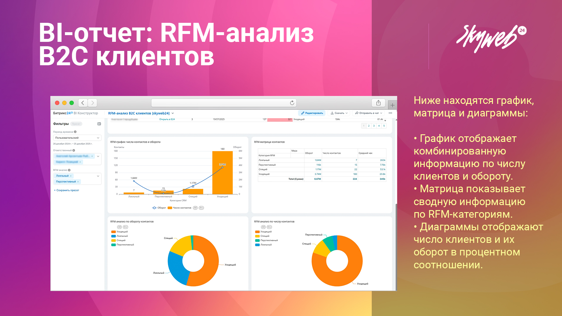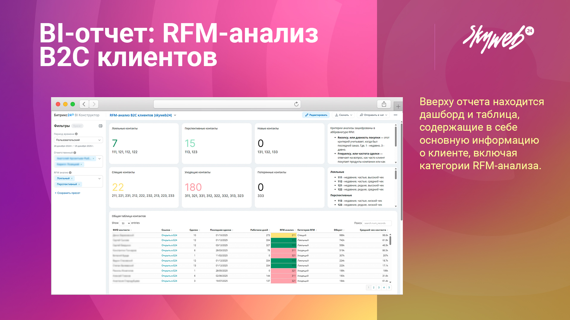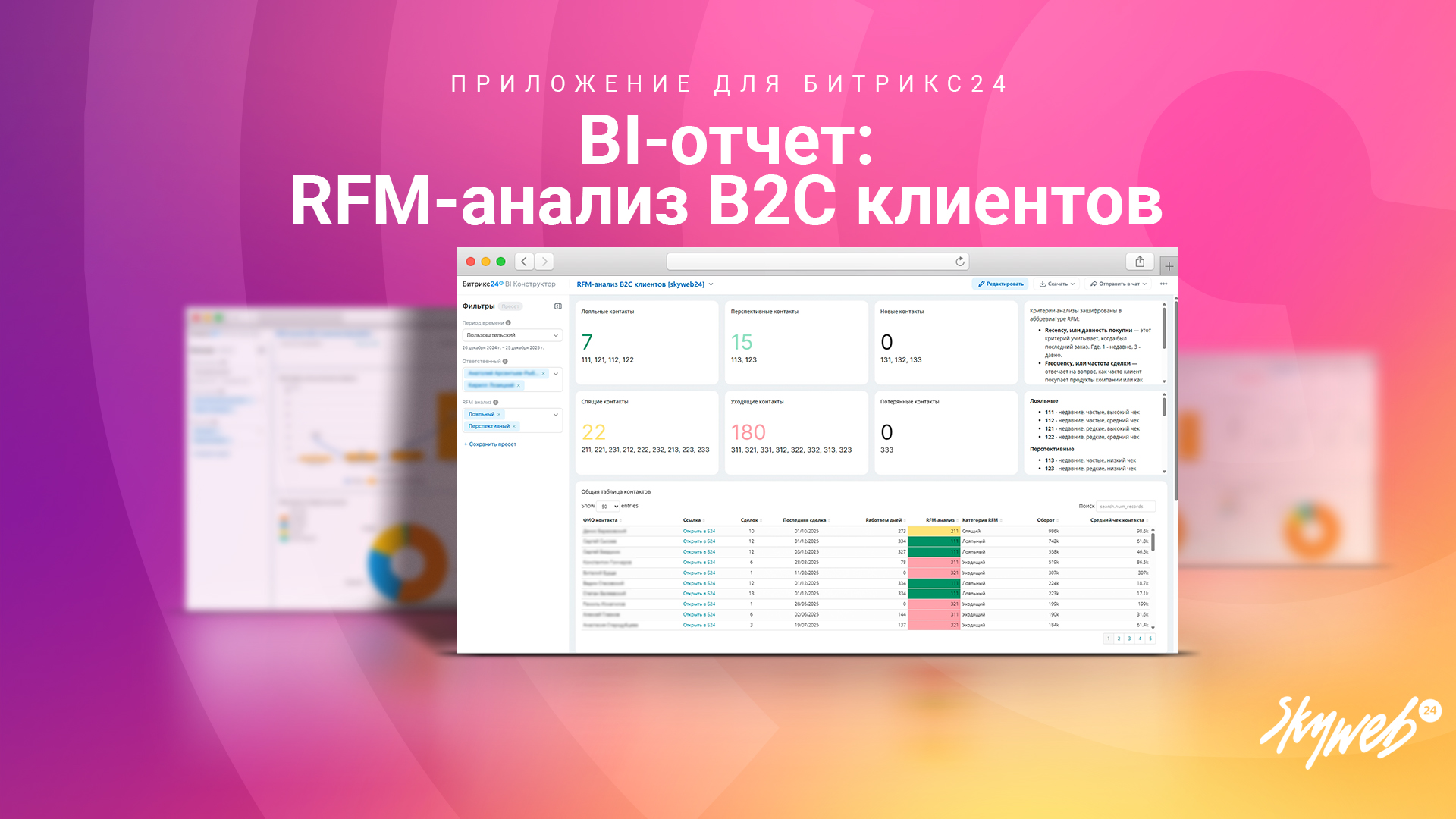 Данный отчет анализирует успешные сделки всех контактов вашей CRM и автоматически сегментирует их по категориям RFM-анализа, в зависимости от оборота, числа сделок и давности последней сделки.