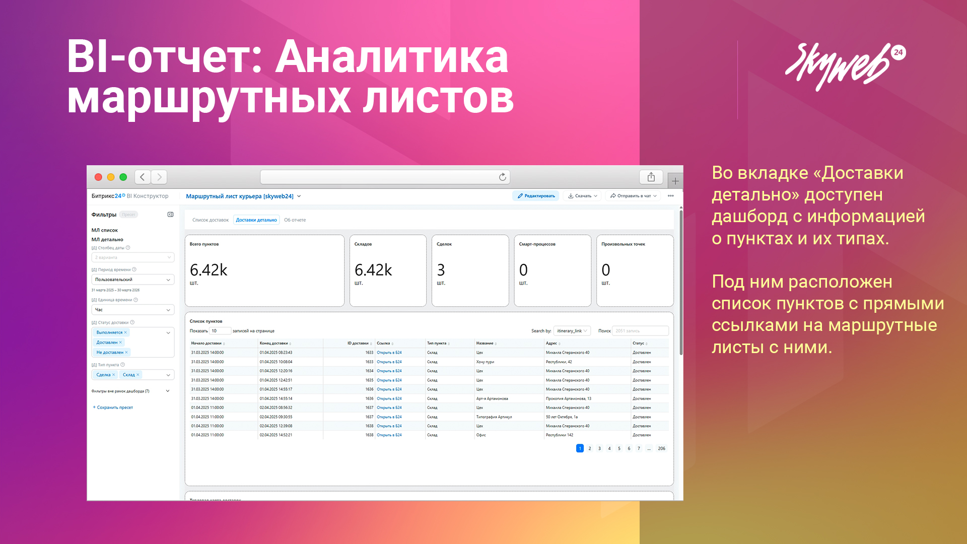 Отчёт создан для BI‑конструктора Битрикс24 и позволяет комплексно анализировать данные по доставкам.