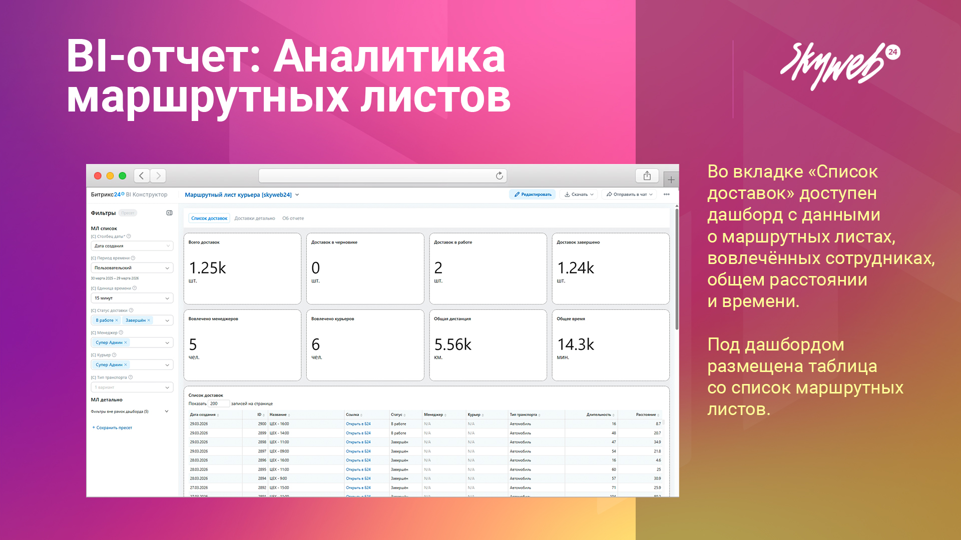 - Удобная фильтрация по датам, менеджерам, курьерам, статусам и транспорту.