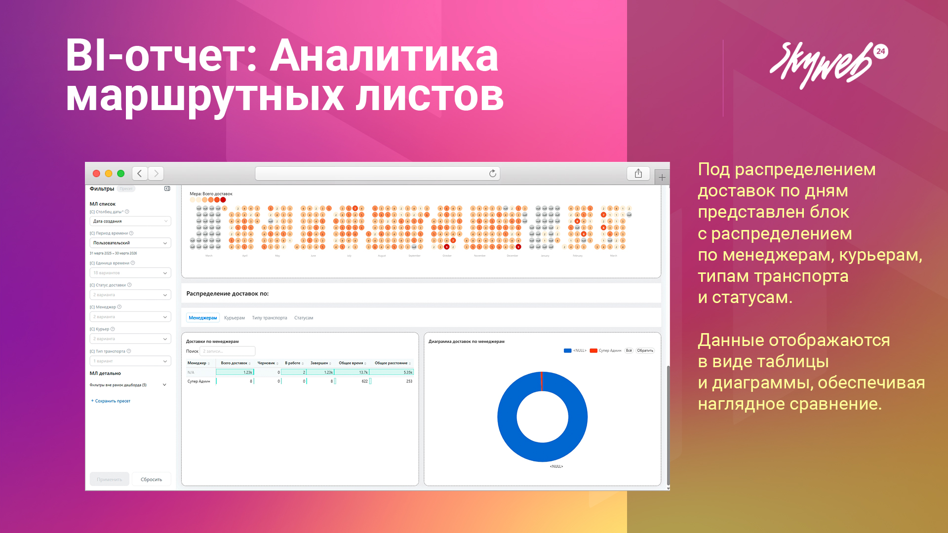 - Распределение по менеджерам/курьерам/транспорту/статусам - таблицы и диаграммы распределения доставок.