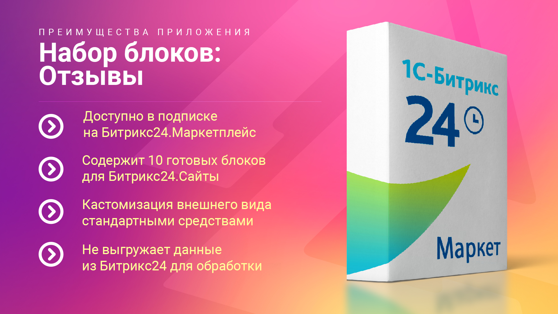 В наборе — 10 полностью настраиваемых блоков, совместимых со всеми типами сайтов и шаблонами Битрикс24.