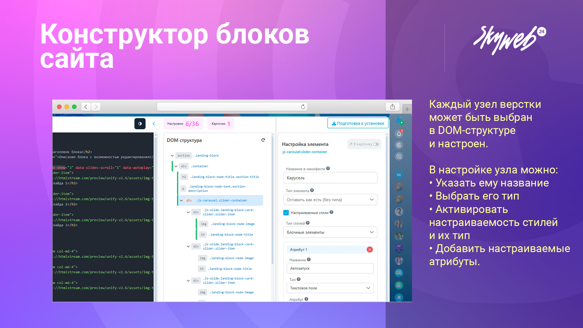 Стандартные блоки Битрикс24 часто ограничивают гибкость дизайна и функционала, мешая реализовать уникальные идеи. Наш конструктор дает свободу — вы сами пишете HTML, CSS и JS, подключаете внешние файлы, настраиваете узлы и управляете стилями. Никаких компромиссов между креативом и реализацией.