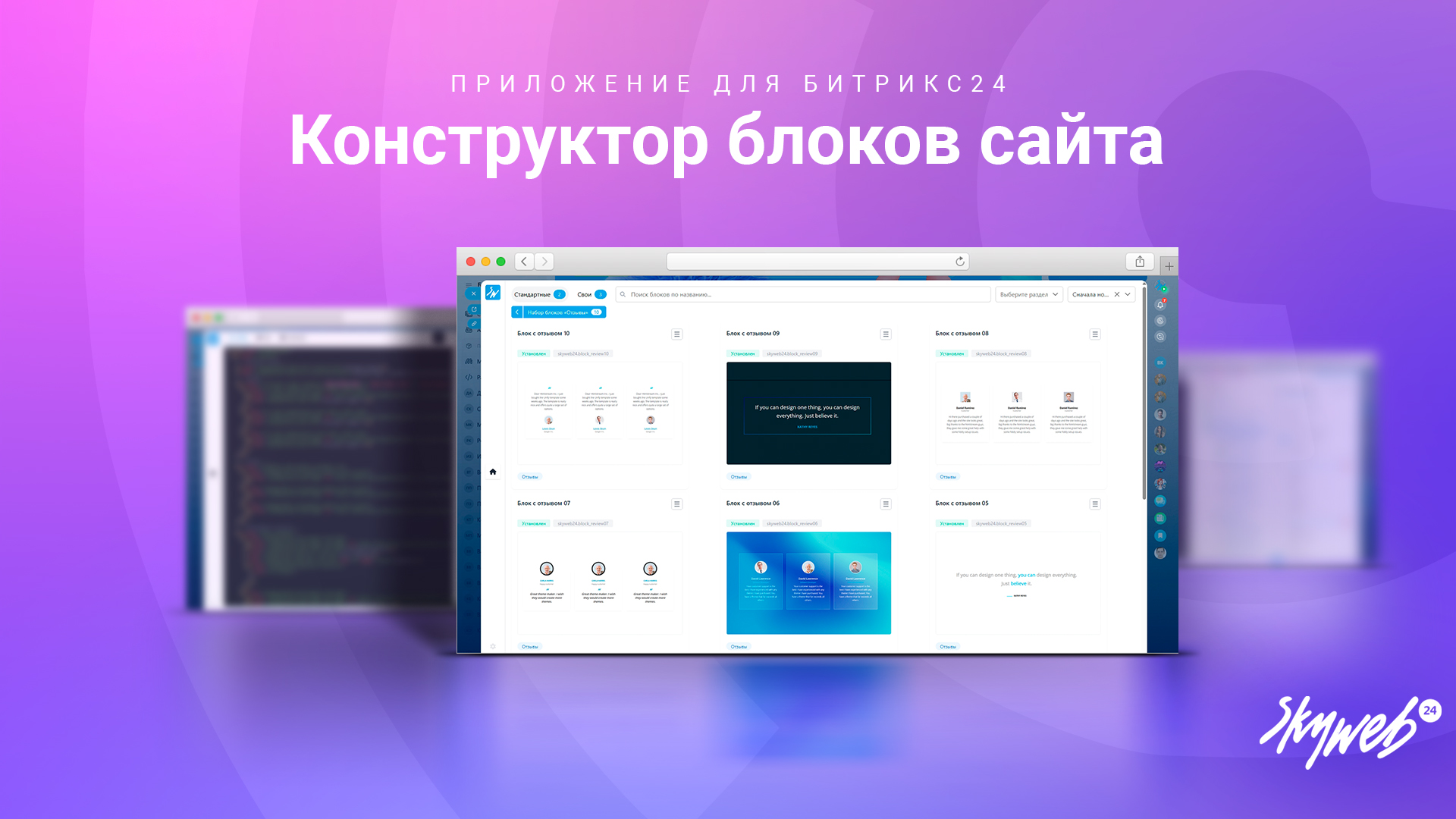 «Конструктор блоков сайта» — это инструмент для разработчиков и дизайнеров, который позволяет создавать, редактировать и настраивать собственные блоки для сайтов на платформе Битрикс24. Полный контроль над версткой, стилями, скриптами и узлами — в одном удобном интерфейсе.