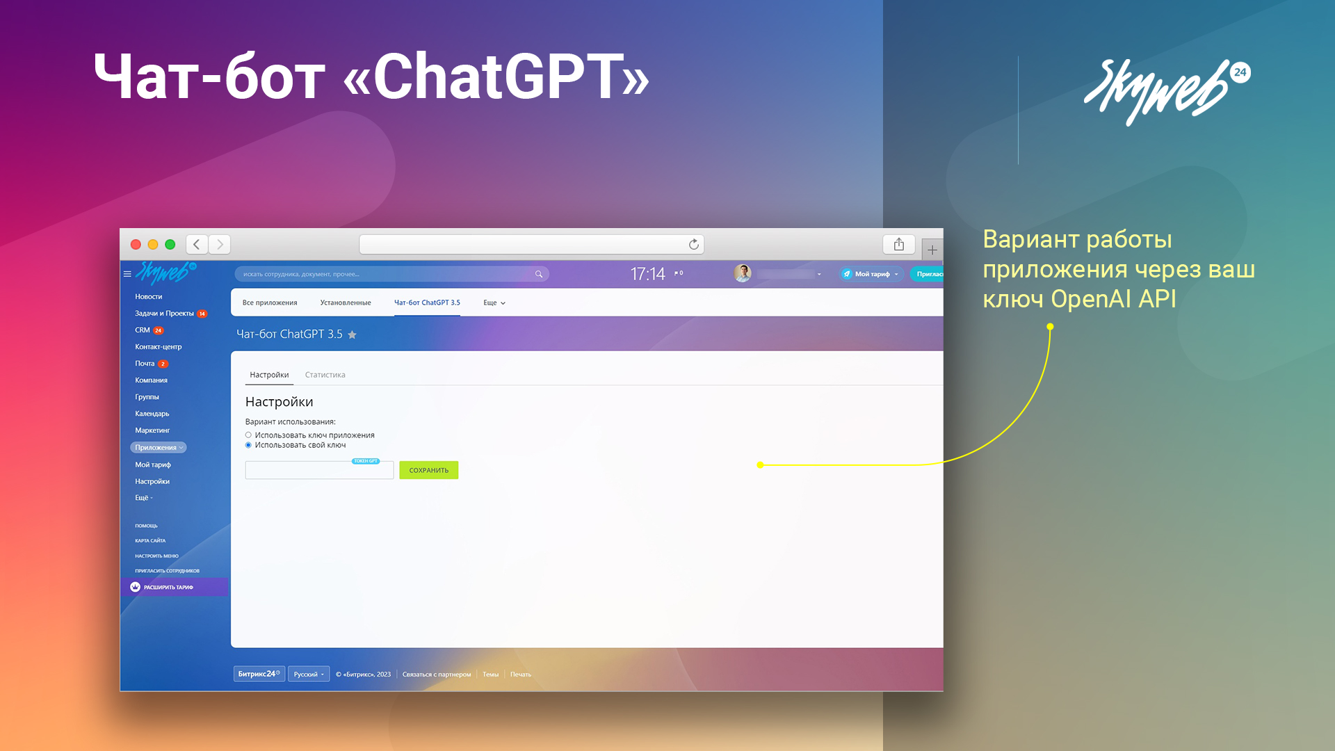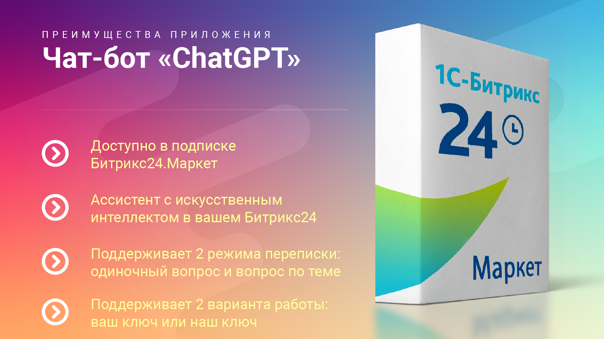 Приложение позволяет добавить популярный инструмент ChatGPT от OpenAI в ваш Битрикс24. Оно предоставляет возможность вести переписку с искусственным интеллектом, который может быть использован каждым сотрудником.