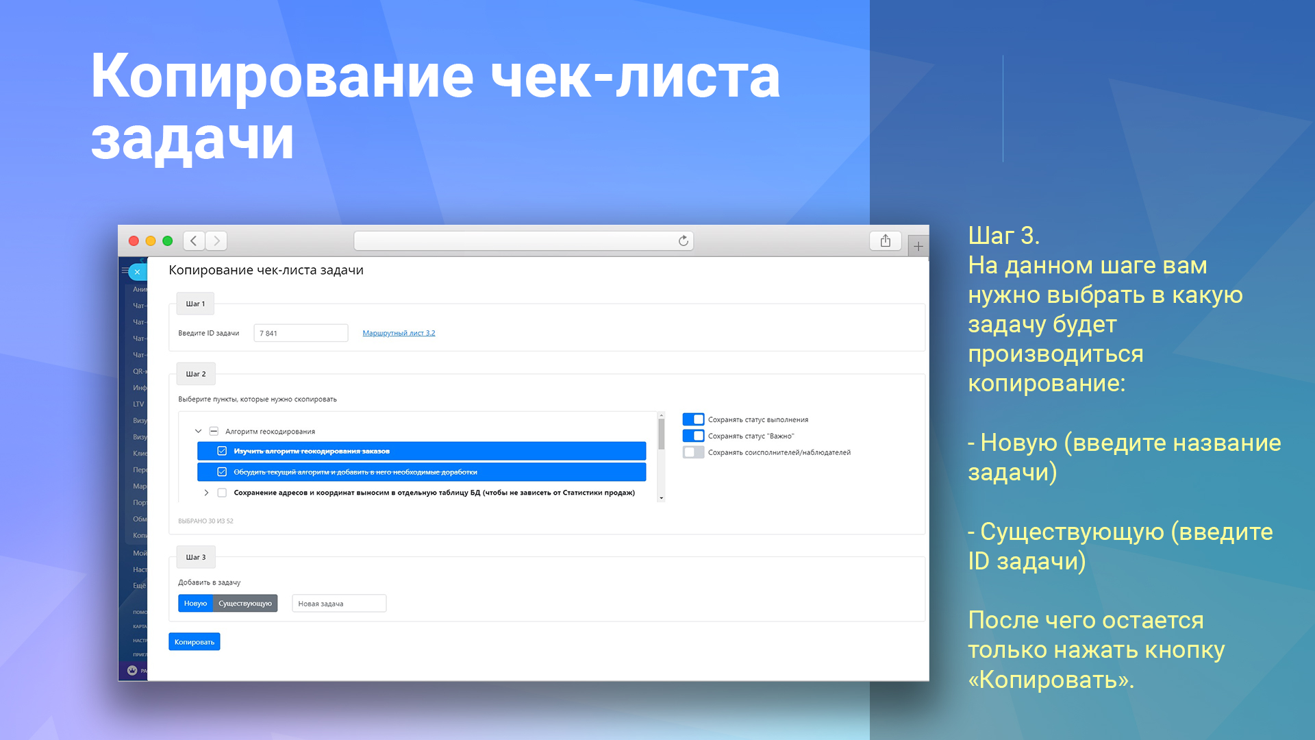 Выберите задачу для копирования чек-листа (новая задача или существующая задача с указанием ID). Нажмите кнопку «Копировать» для начала процесса.