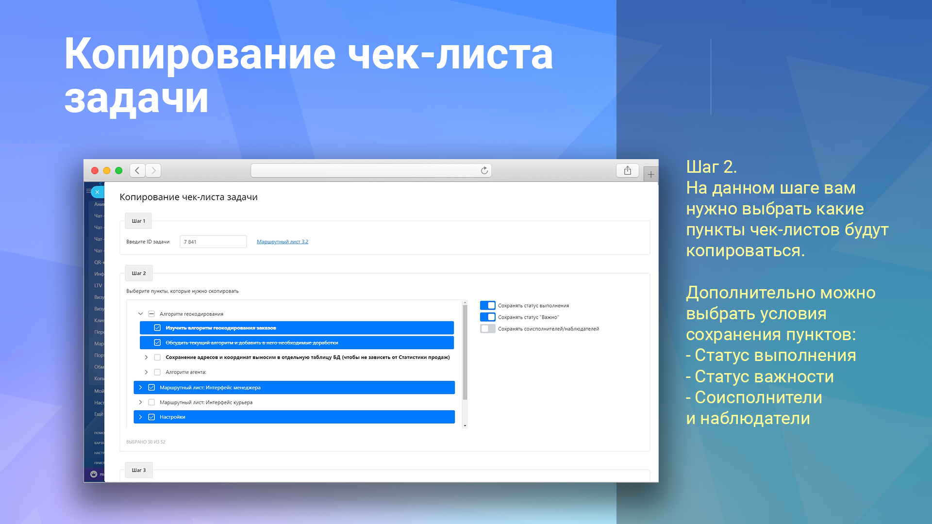 Копируйте чек-листы задачи в пару кликов! Поддерживает сохранение статуса, важности и сотрудников.