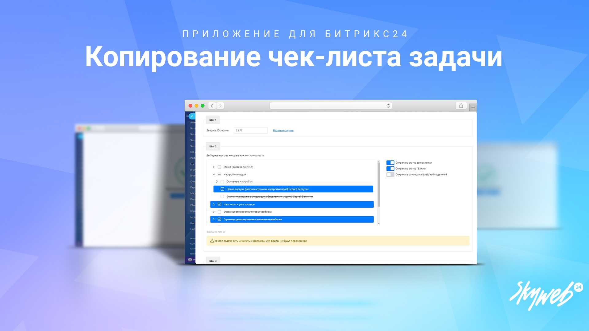 В стандартной CRM Битрикс24 нет удобного способа для копирования чек-листов между задачами. "Копирование чек-листа задачи" от Скайвеб24 решает эту проблему, предоставляя интуитивный инструмент для быстрого копирования чек-листов, что помогает ускорить рабочий процесс и упростить управление задачами.