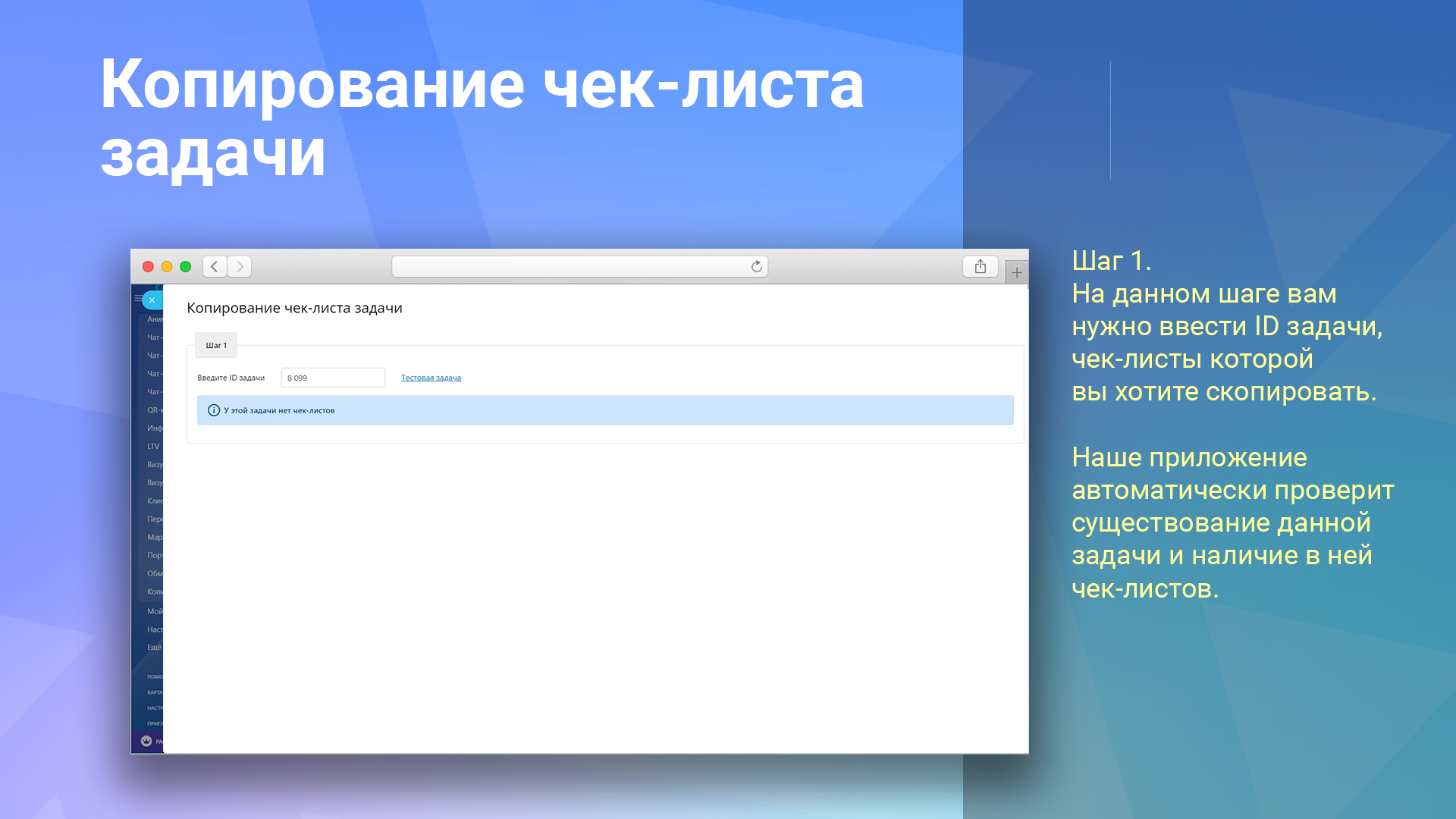 Введите ID задачи, в которой находятся нужные чек-листы. Система проверит наличие задачи и ее чек-листов.