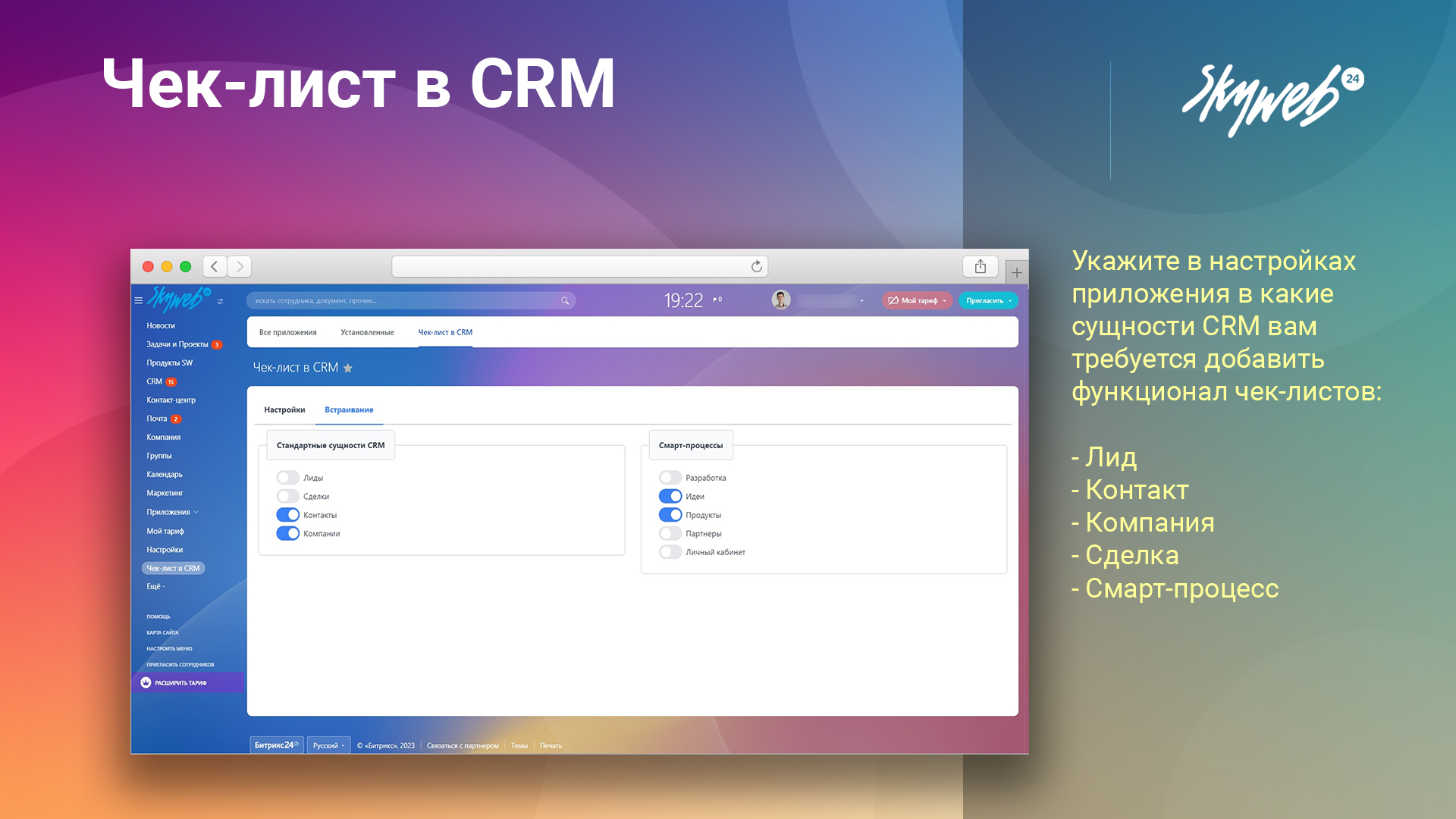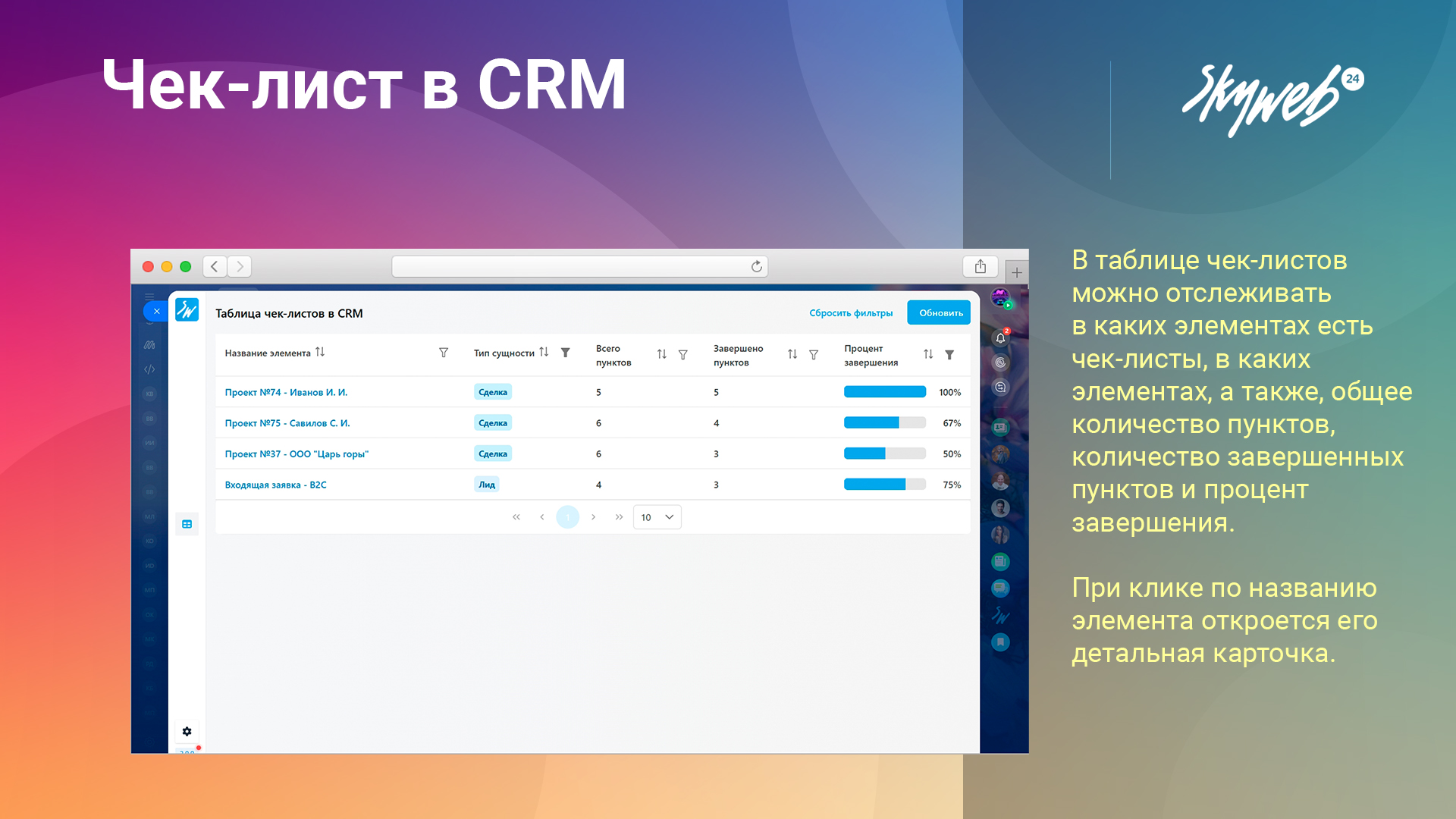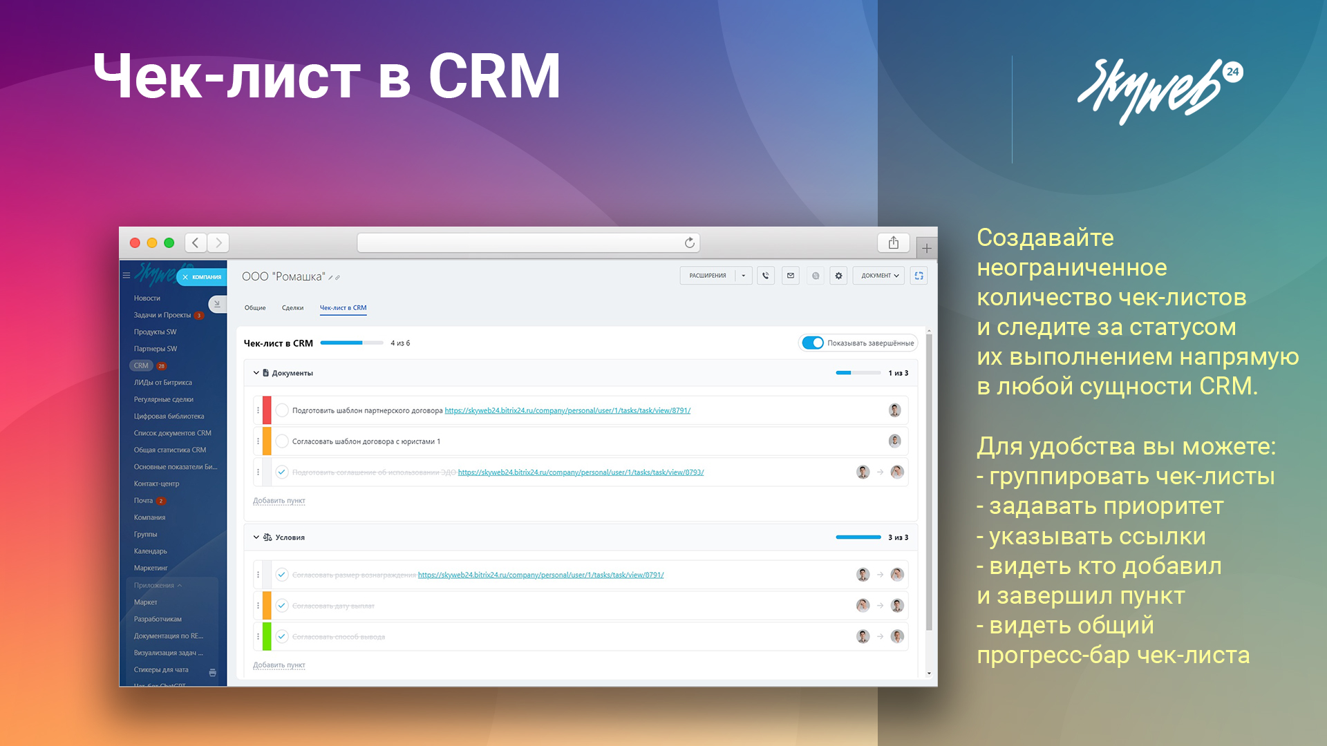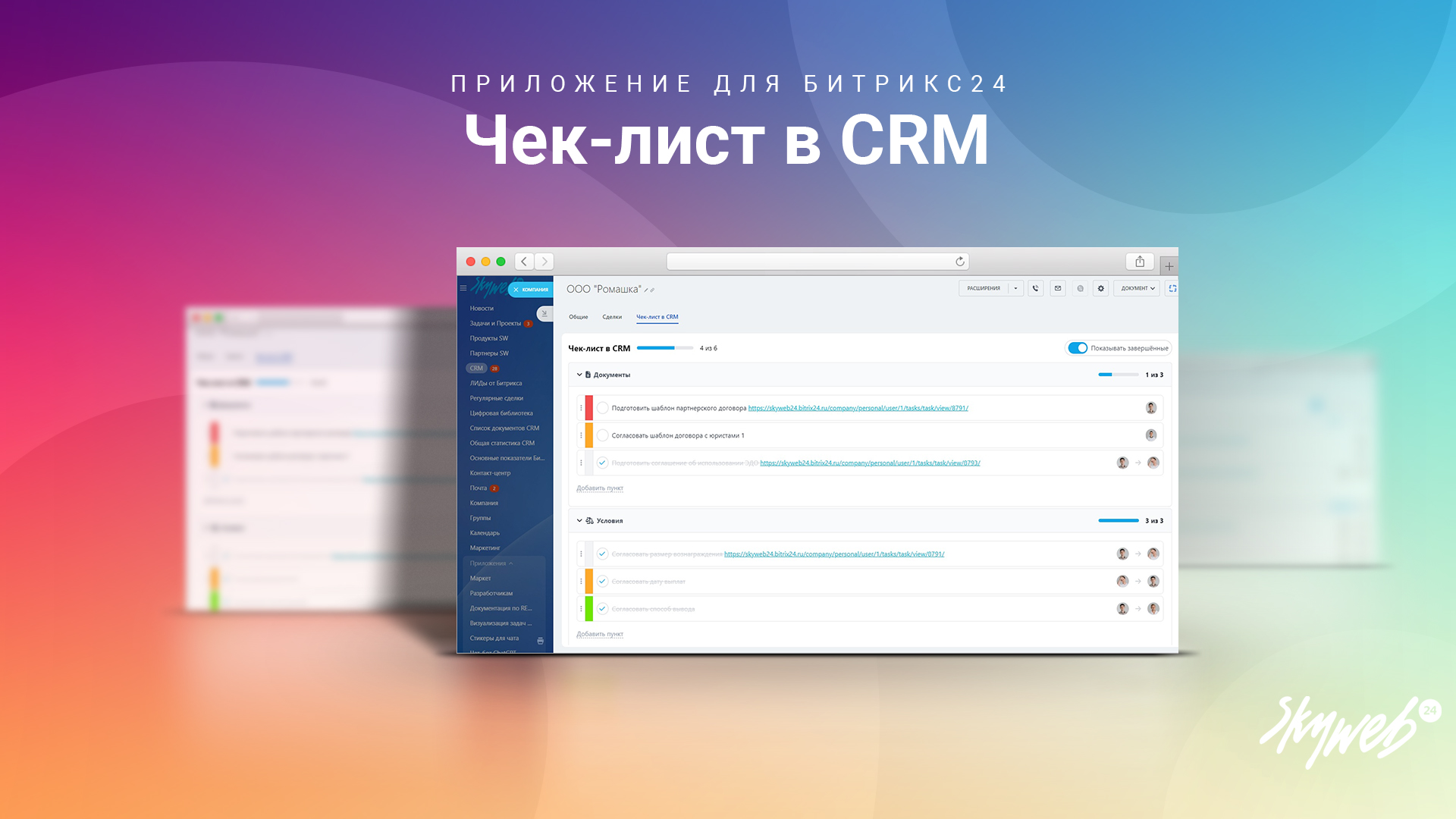 В стандартной CRM Битрикс24 нет удобного способа для добавления чек-листов к различным сущностям. "Чек-лист CRM" от Скайвеб24 решает эту проблему, предоставляя гибкий инструмент для создания и управления чек-листами, что помогает улучшить контроль за выполнением задач и повышает эффективность работы.