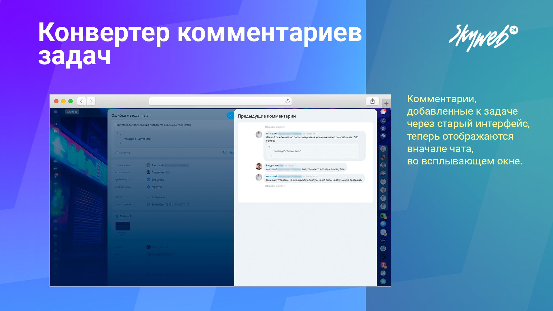 Комментарии, добавленные к задаче через старый интерфейс, теперь отображаются в начале чата, во всплывающем окне. Это создает дополнительные клики, чтобы увидеть важную информацию.