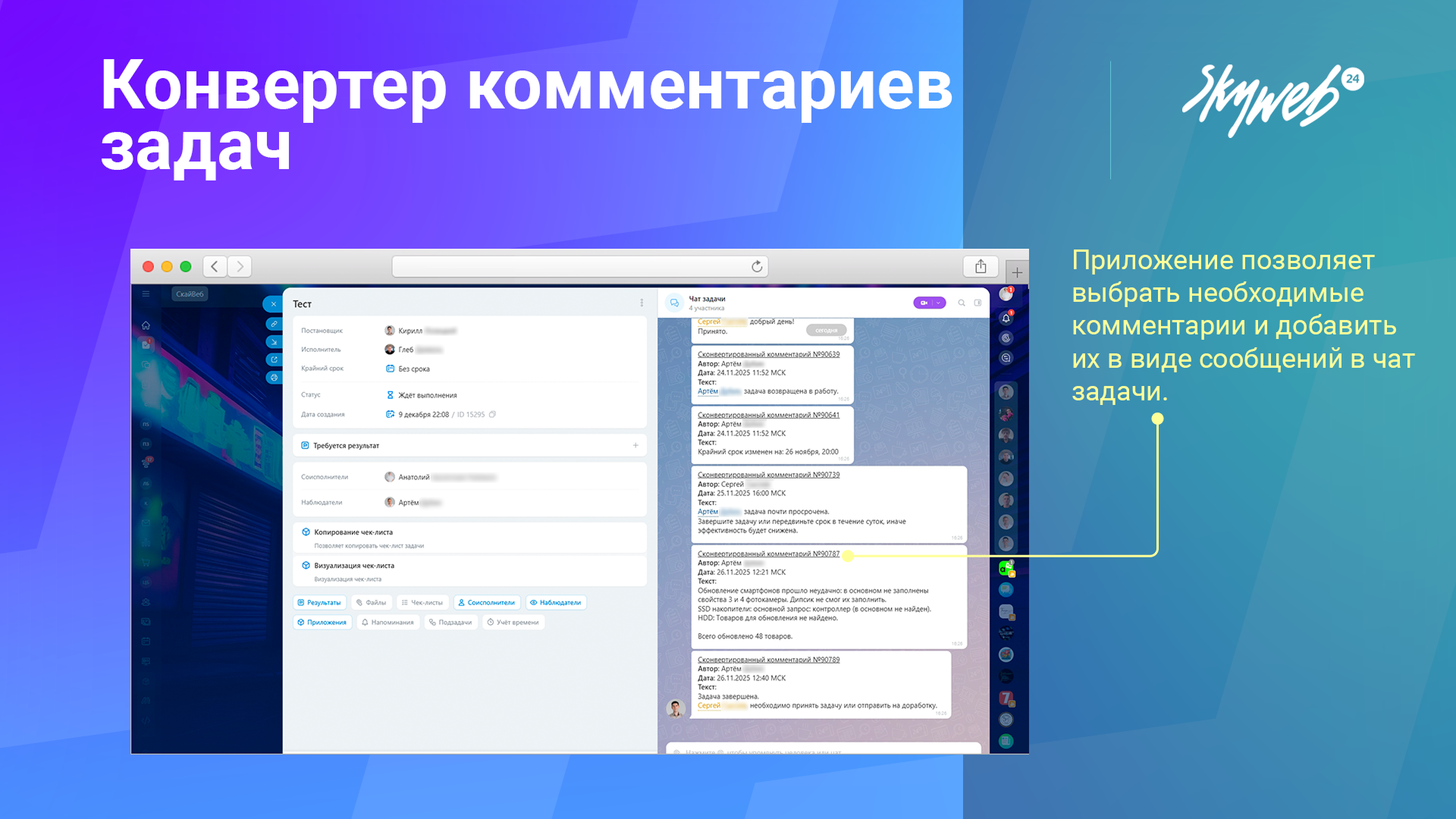 Конвертируйте нужные комментарии задач в сообщения чата