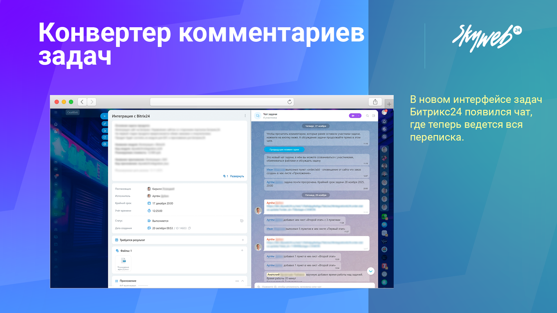- В новом интерфейсе задач Битрикс24 появился чат, где теперь ведется вся переписка.