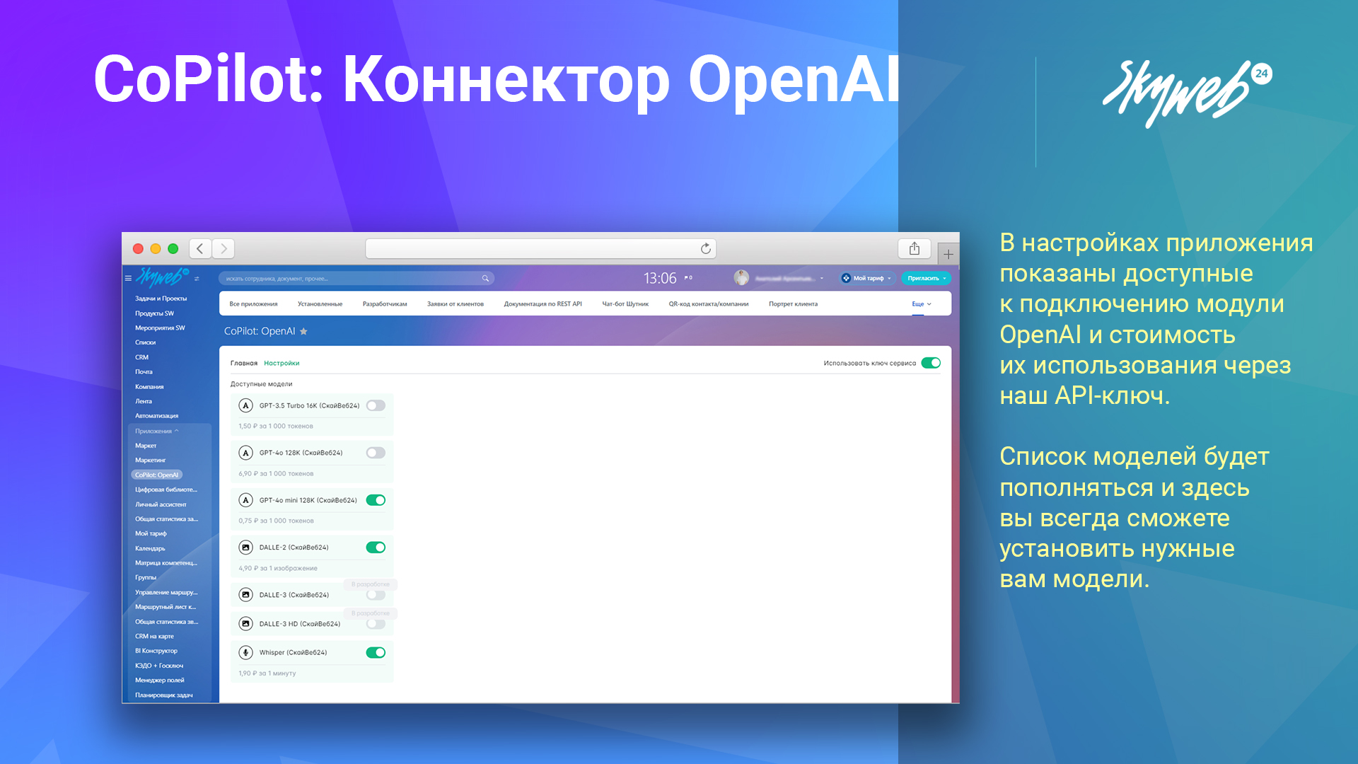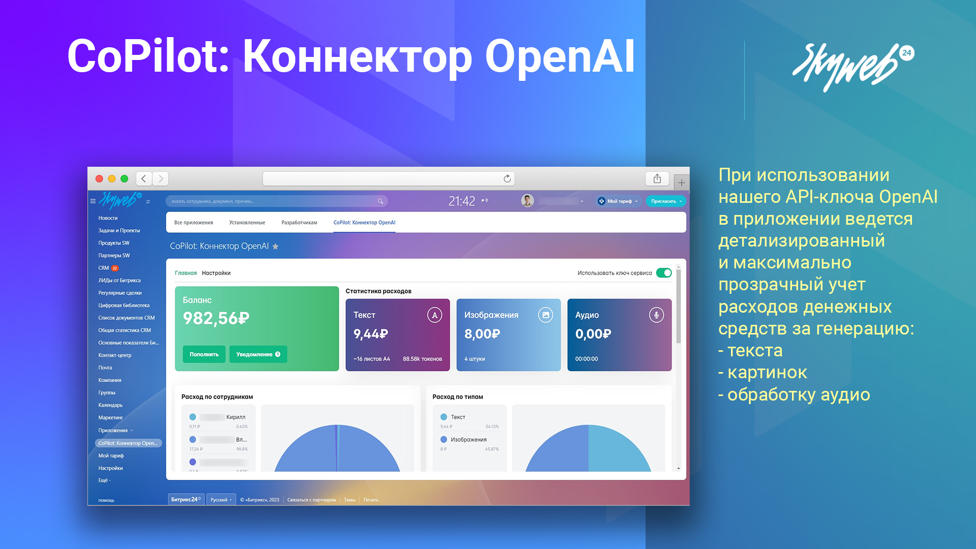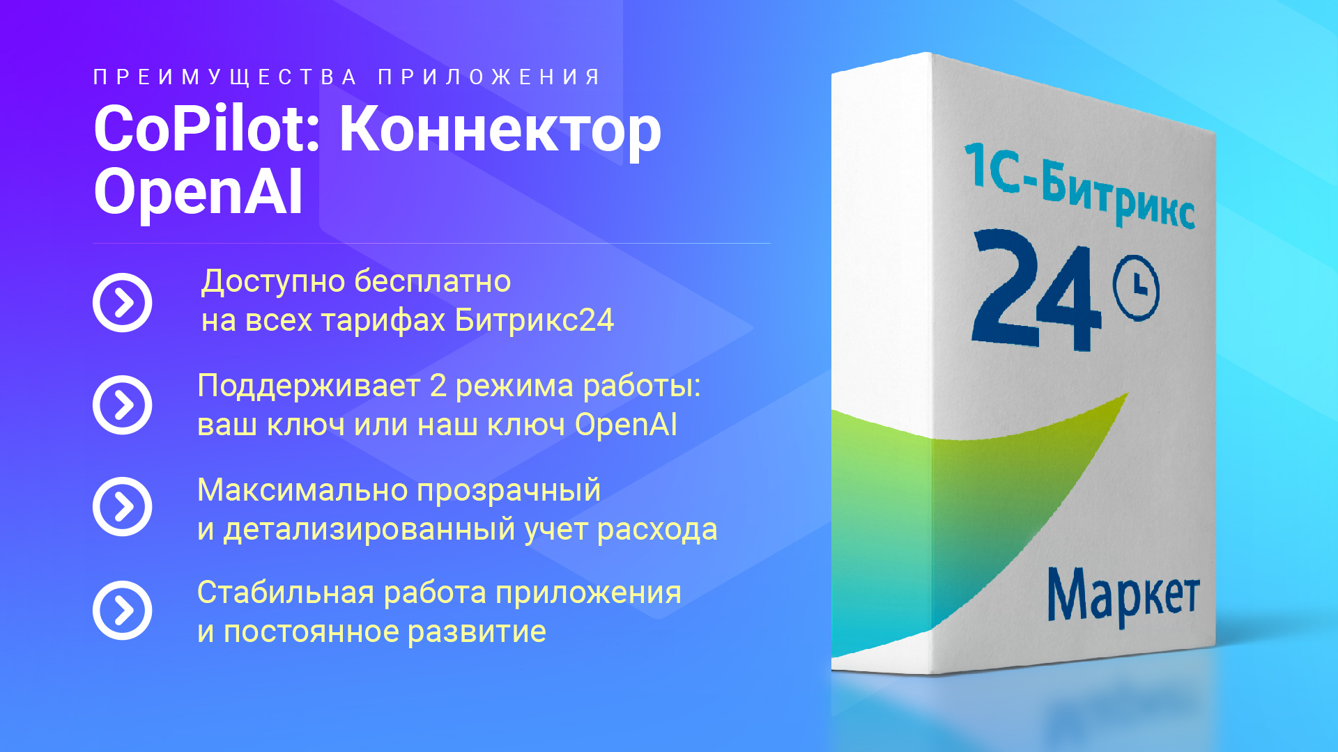 В стандартной CRM Битрикс24 нет удобного способа для подключения моделей OpenAI. "CoPilot: Коннектор OpenAI" от Скайвеб24 решает эту проблему, предоставляя полный доступ к функционалу OpenAI, поддерживая все современные модели и обеспечивая гибкость в использовании API-ключей.