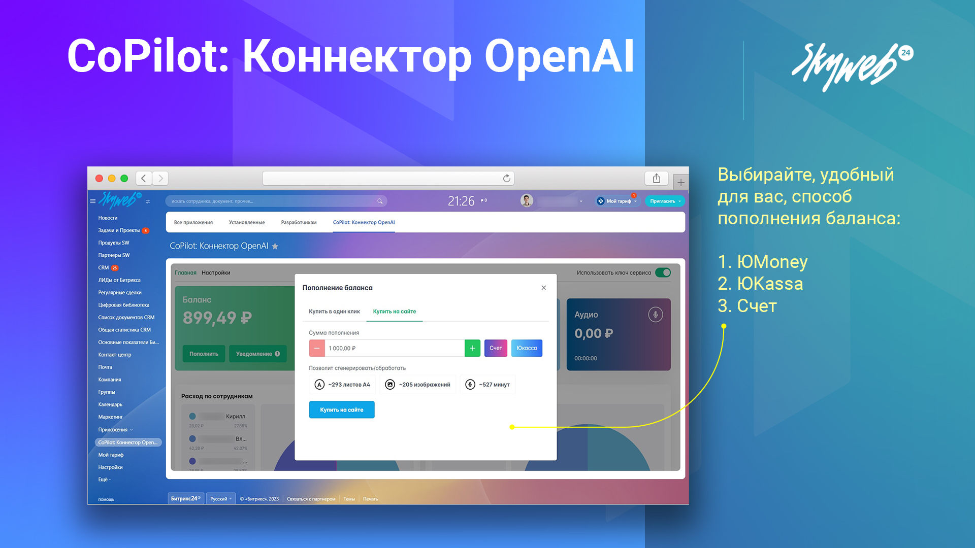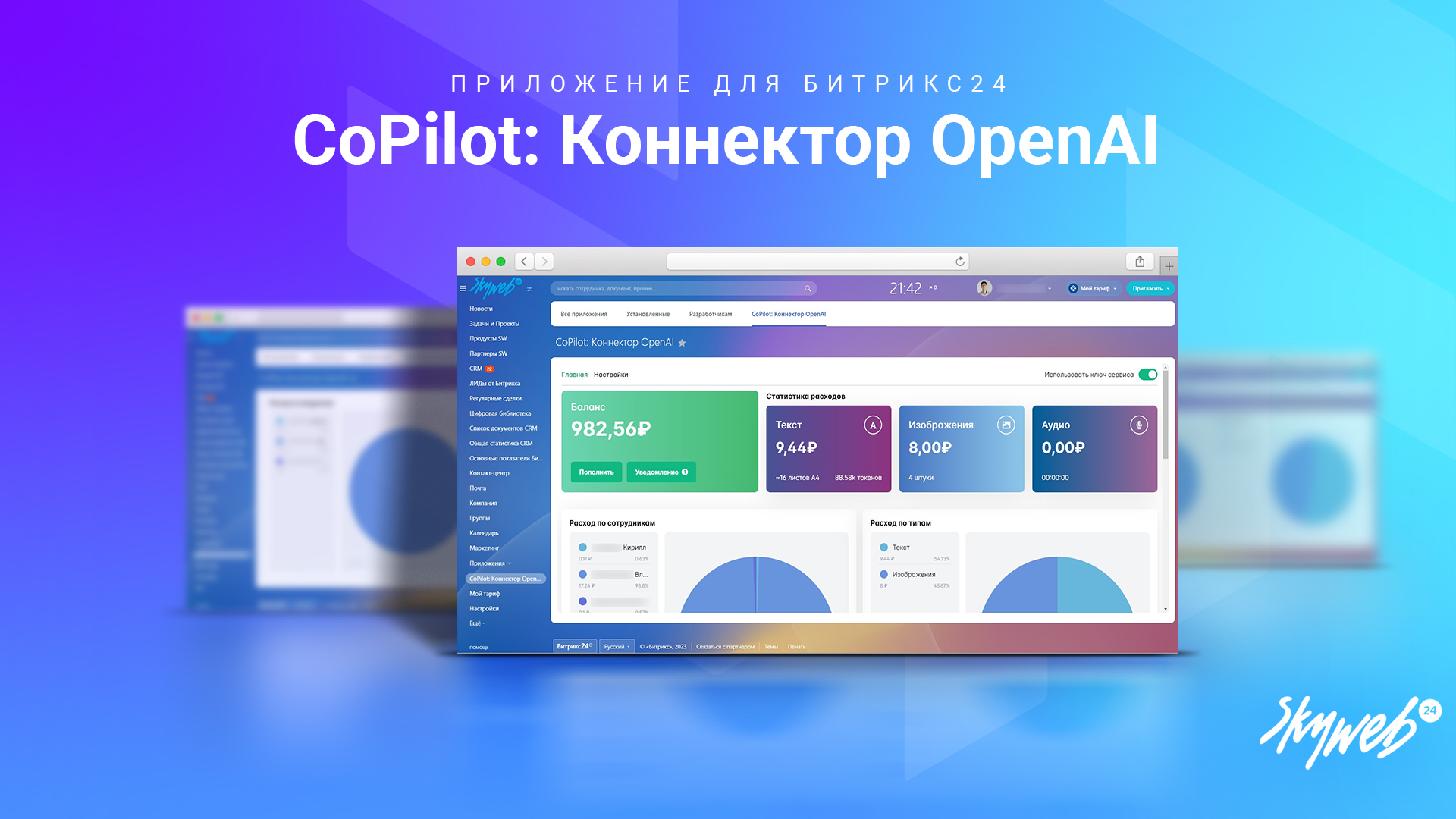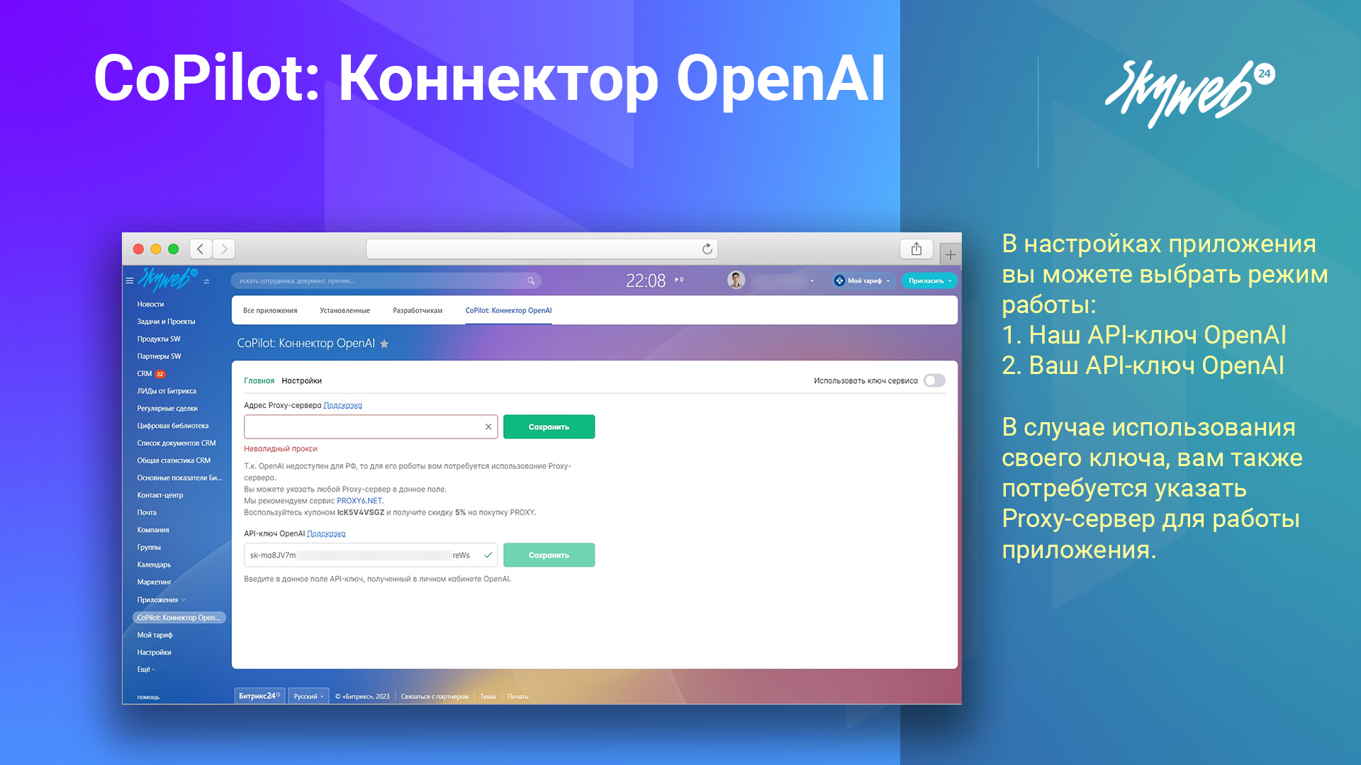 В стандартной CRM Битрикс24 нет удобного способа для подключения моделей OpenAI. "CoPilot: Коннектор OpenAI" от Скайвеб24 решает эту проблему, предоставляя полный доступ к функционалу OpenAI, поддерживая все современные модели и обеспечивая гибкость в использовании API-ключей.