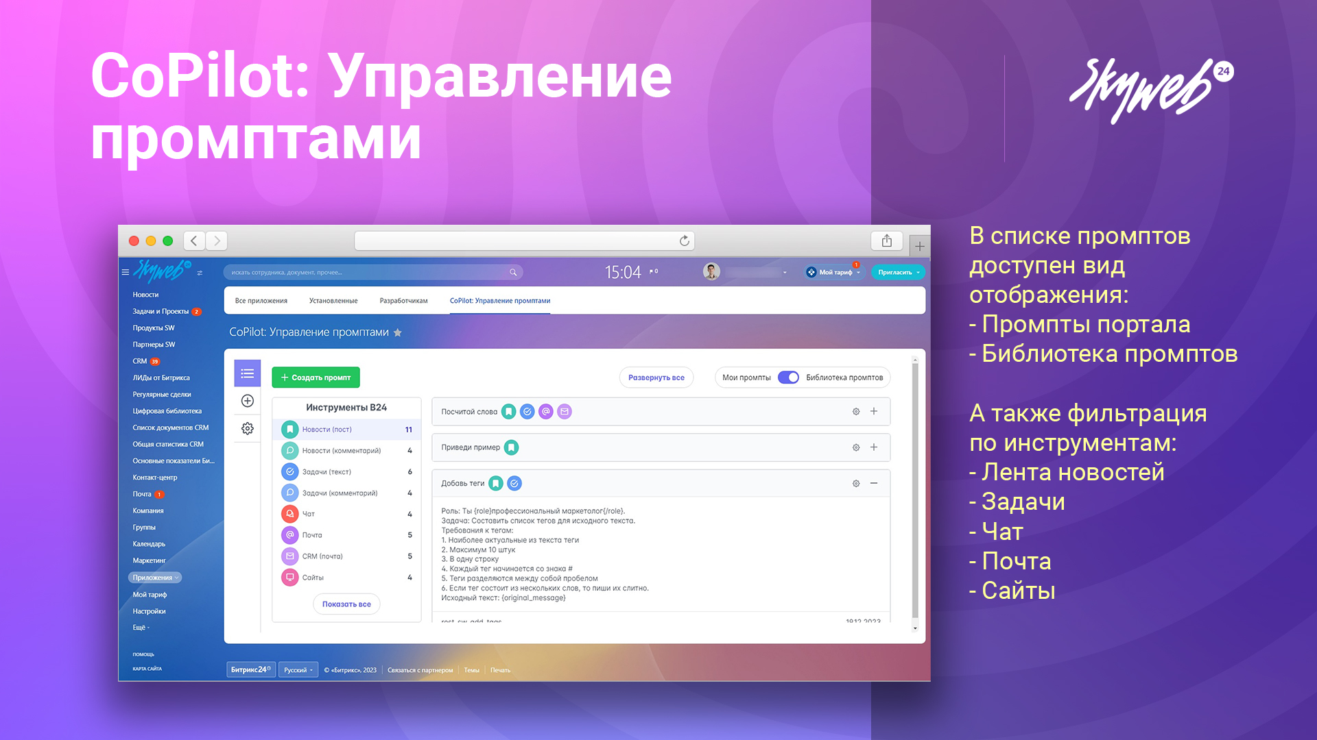 В стандартной CRM Битрикс24 нет удобного способа для создания и управления промптами. "CoPilot: Управление промптами" от Скайвеб24 решает эту проблему, предоставляя инструмент для гибкого создания и управления промптами, что помогает улучшить функциональные возможности и удобство использования CoPilot.