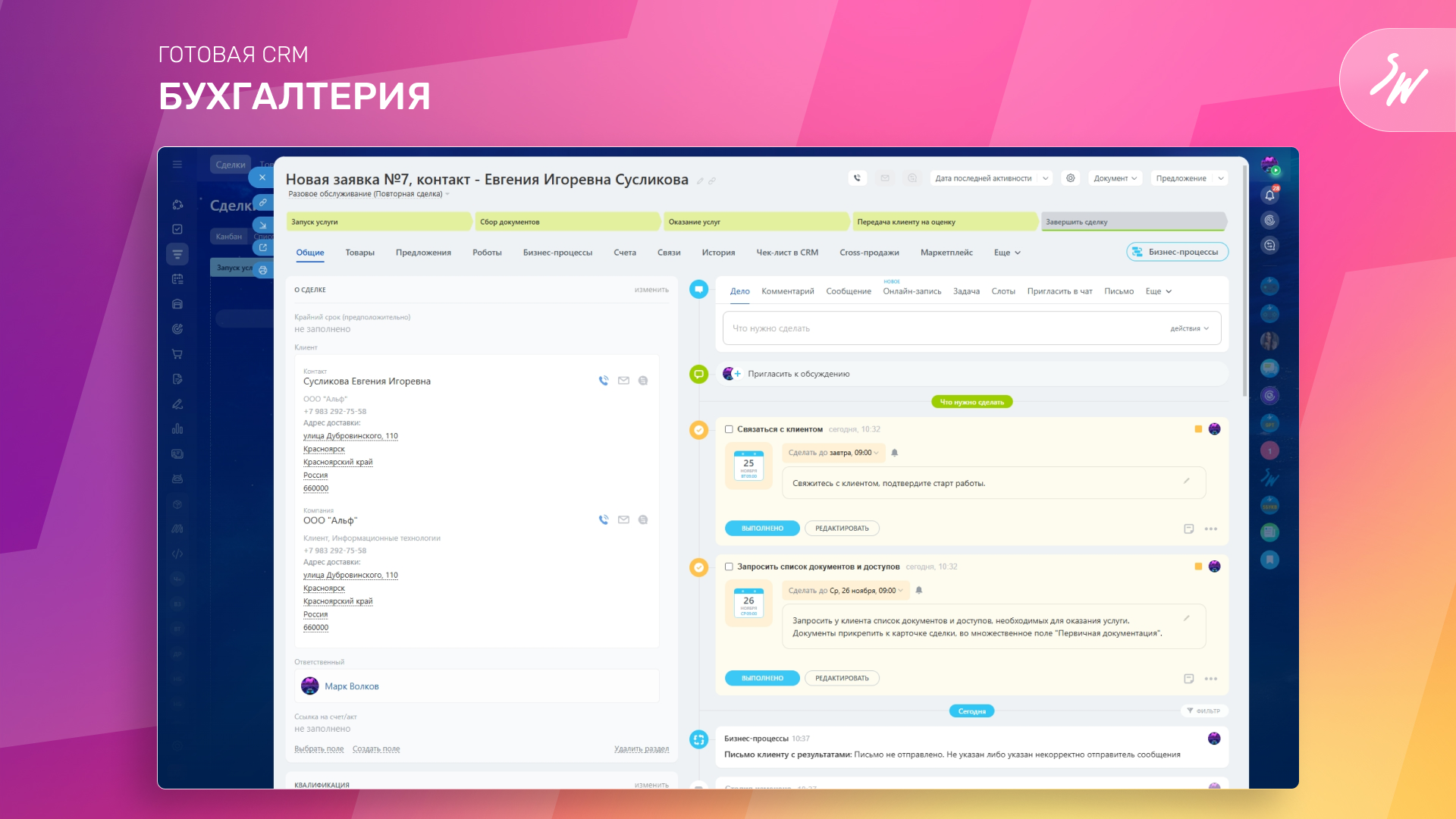 Каждое действие — от обработки заявки до завершения оказания услуги — сопровождается автоматическими напоминаниями, постановкой задач, контролем сроков и отправкой писем клиенту. Это снижает нагрузку на сотрудников и позволяет сосредоточиться на ключевой работе с финансами.