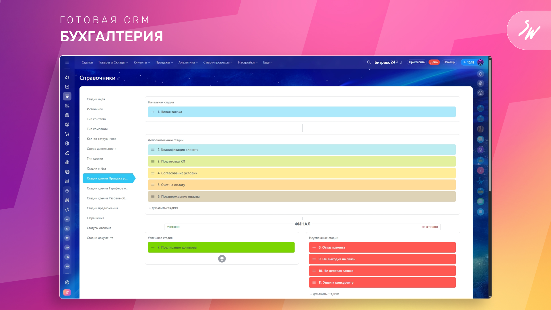 - Не выходит на связь - стадия неуспешного завершения сделки. На данную стадию сделка переносится вручную, если клиент не выходит на связь.