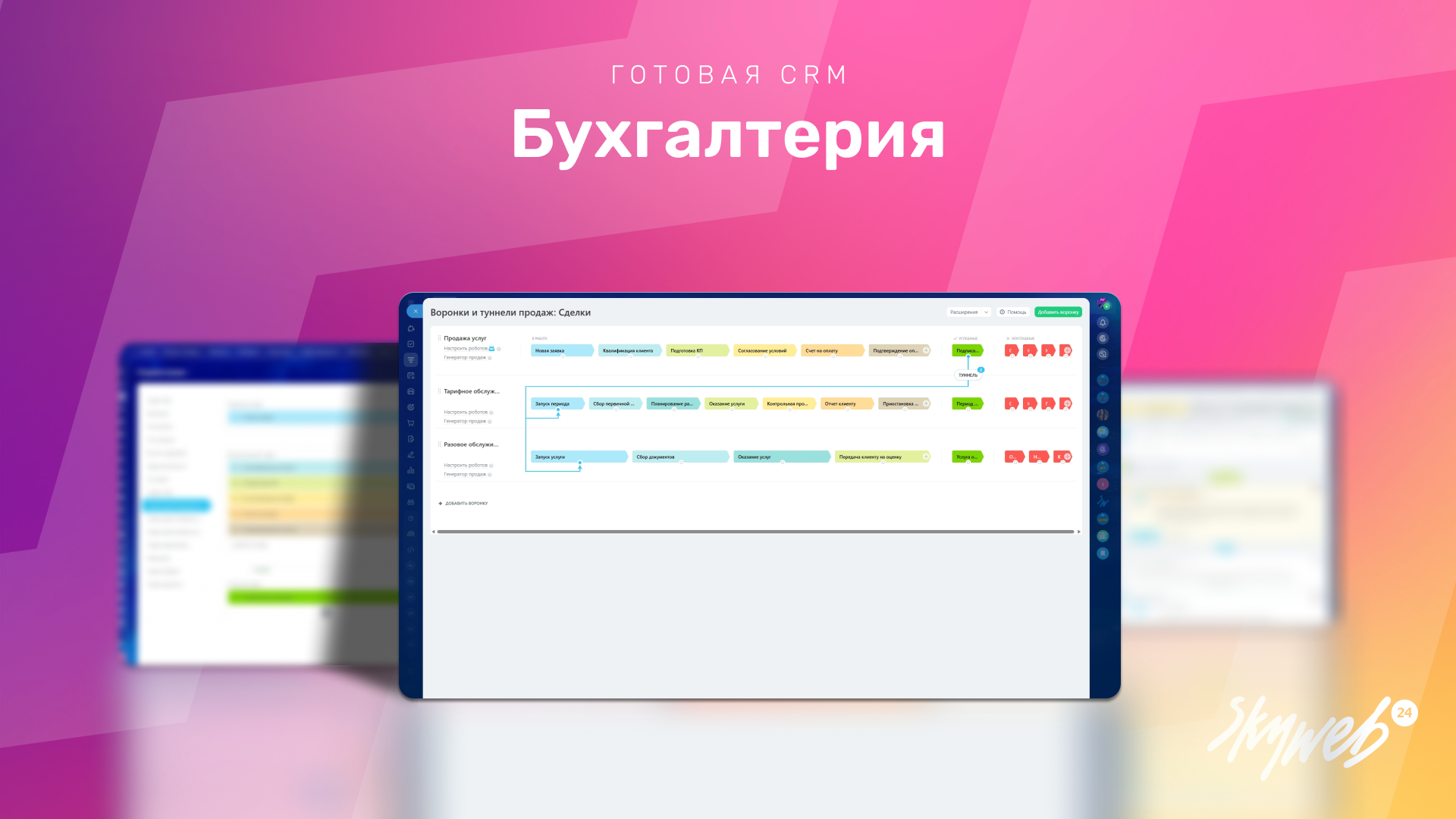 Три готовые воронки — для продаж, разовых услуг и тарифных пакетов. Такой подход разделяет коммерческие и бухгалтерские этапы, повышает контроль и делает процесс понятным на каждом шаге — от первого обращения до завершения работы.