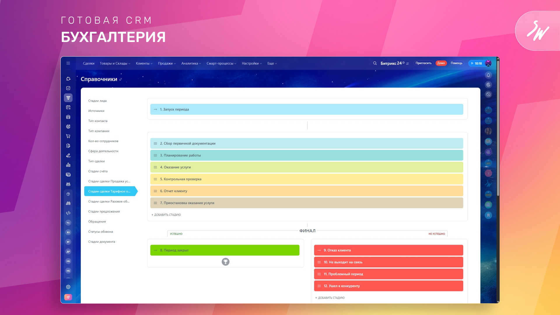 - Приостановка оказания услуг - на эту стадии перемещается сделка, когда по той или иной причине работы приостанавливаются.