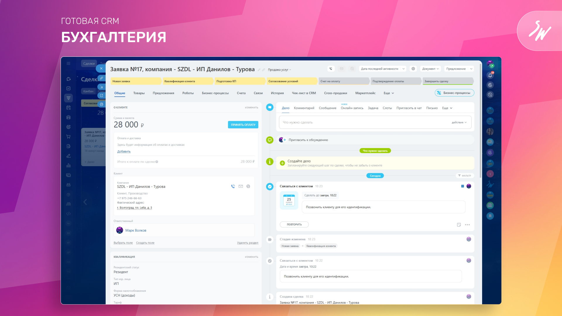 Уведомления, дела, планирование, контроль оплат и история общения — всё собрано в одном месте. Это снижает количество ошибок и гарантирует соблюдение сроков.