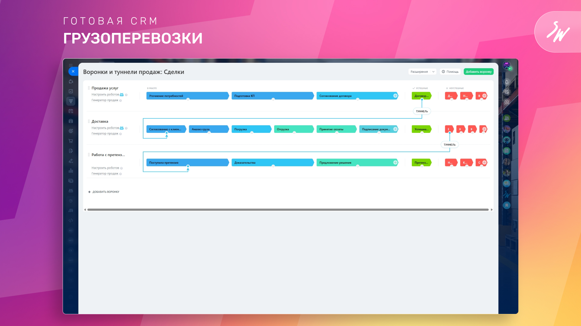 Наше решение разделяет работу со сделками на три воронки, объединённые туннелем продаж: