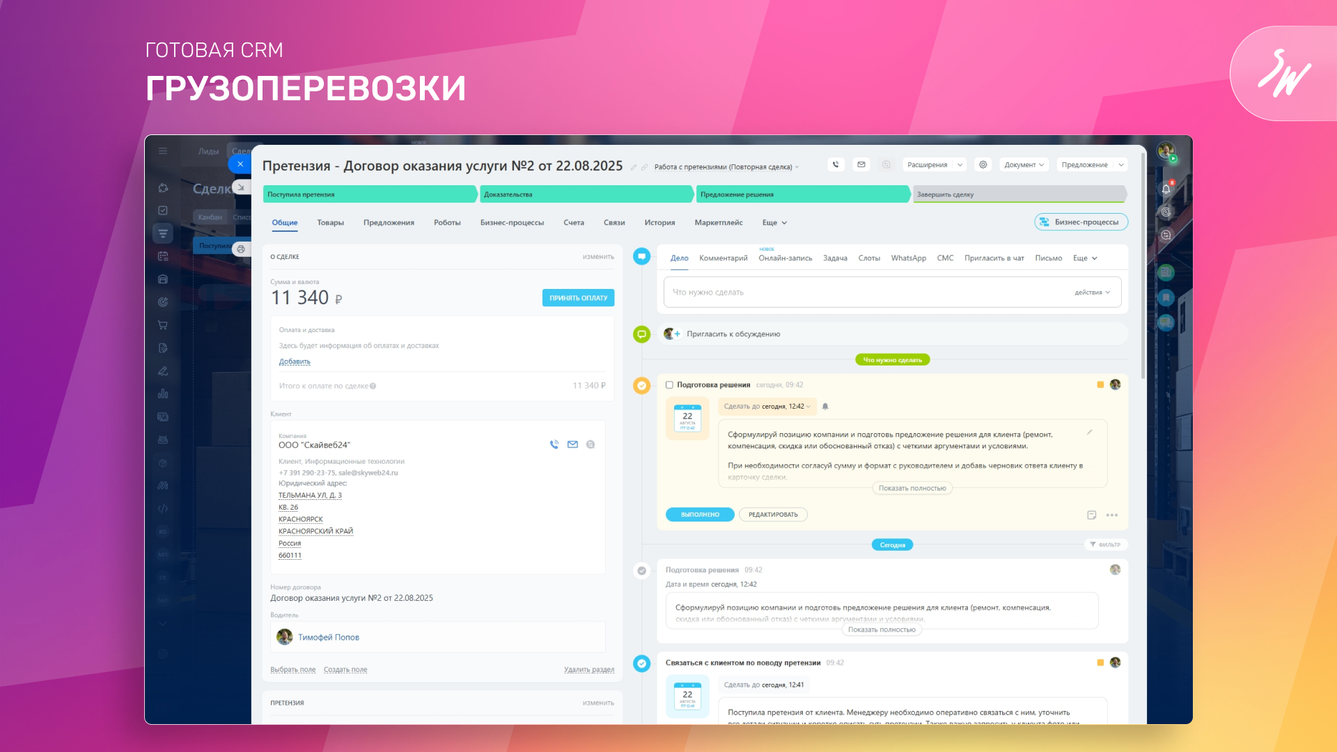 Каждое действие - от обработки заявки до работы с претензиями - сопровождается автоматической постановкой дел, отправкой уведомлений и напоминаниями о важных действиях. Это поможет всем участникам процесса быть в курсе текущих стадий работы.