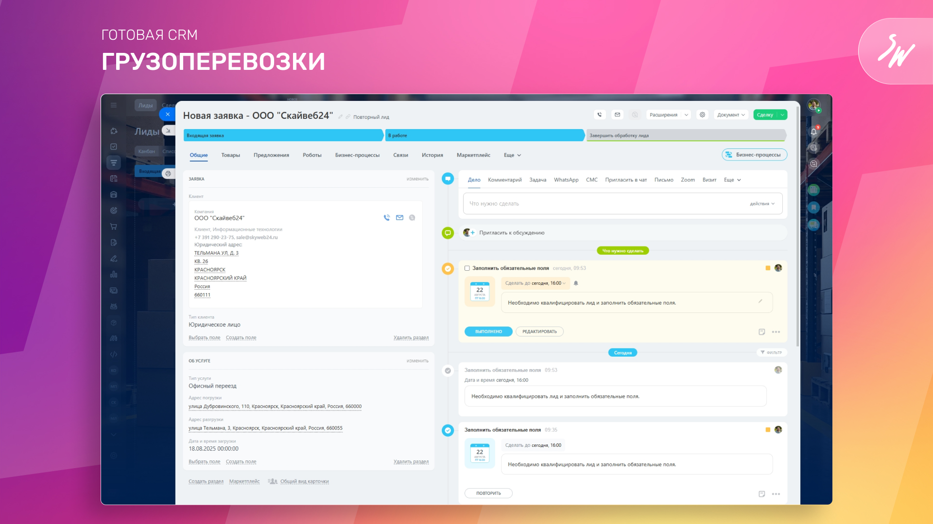 Многие компании, работающие в сфере грузоперевозок, переездов и курьерских услуг, сталкиваются с трудностями при организации рабочих процессов: отсутствует единая точка управления заявками, воронки продаж не структурированы, данные о клиентах, маршрутах и претензиях разбросаны по различным системам. Это приводит к потере лидов, ошибкам при выполнении заказов и усложнению контроля над логистикой и качеством обслуживания.