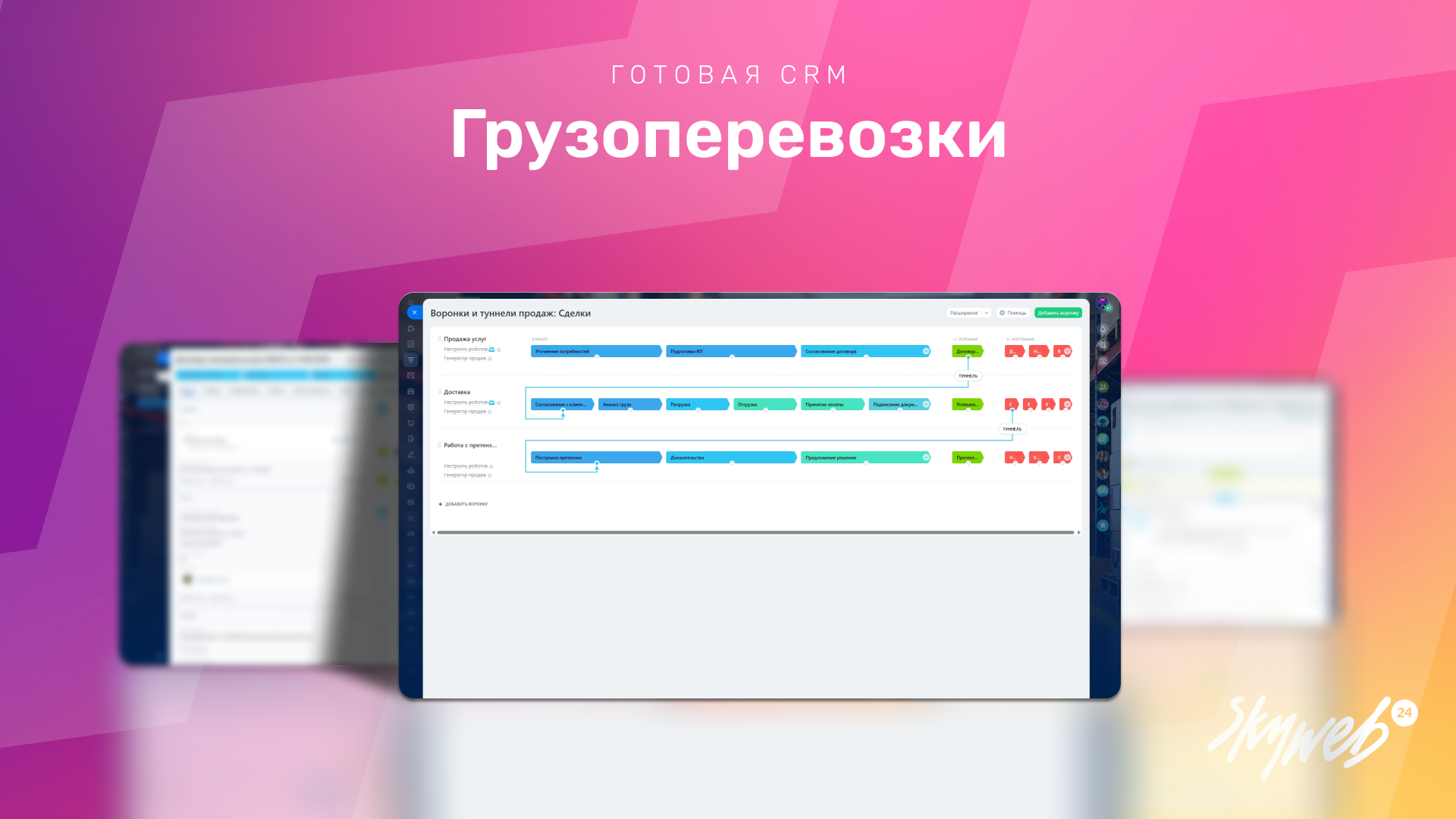CRM использует раздельные воронки для продажи, выполнения услуг и обработки претензий. Это позволяет точно управлять каждым этапом, задавать нужные поля и учитывать специфику задачи.