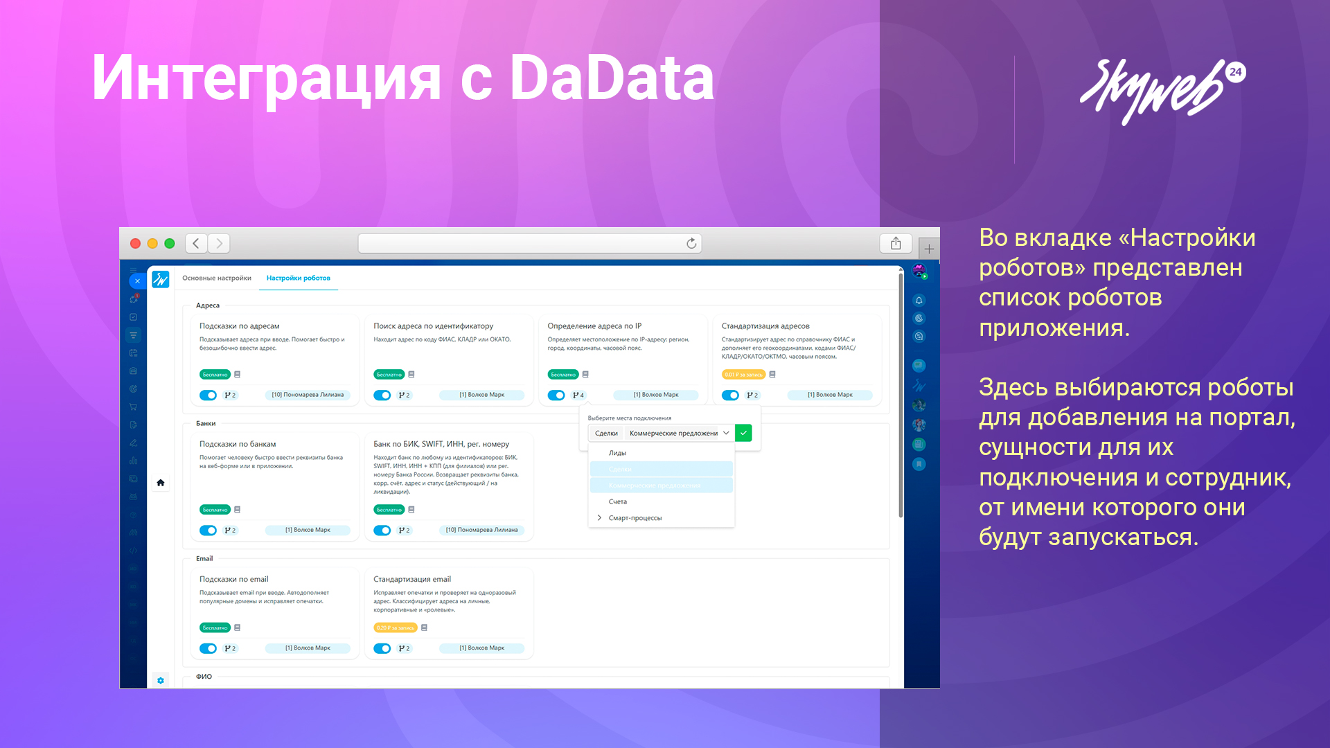 Неточные или неполные данные в CRM приводят к ошибкам в коммуникации, потере времени и снижению качества обслуживания. Наше приложение добавляет на портал 15 умных роботов, каждый из которых соответствует конкретному методу DaData, чтобы: