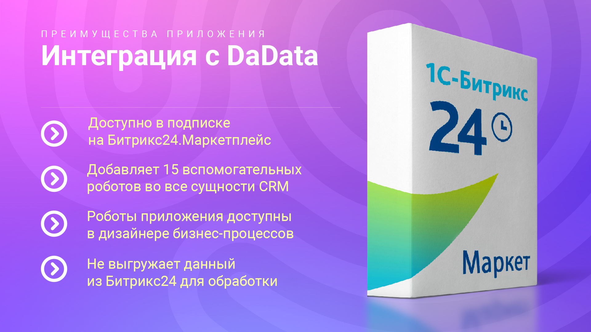 Интеграция с DaData автоматически проверяет, дополняет и стандартизирует информацию о клиентах прямо в Битрикс24, чтобы вы работали только с актуальными контактами, ускоряли сделки и повышали качество сервиса.