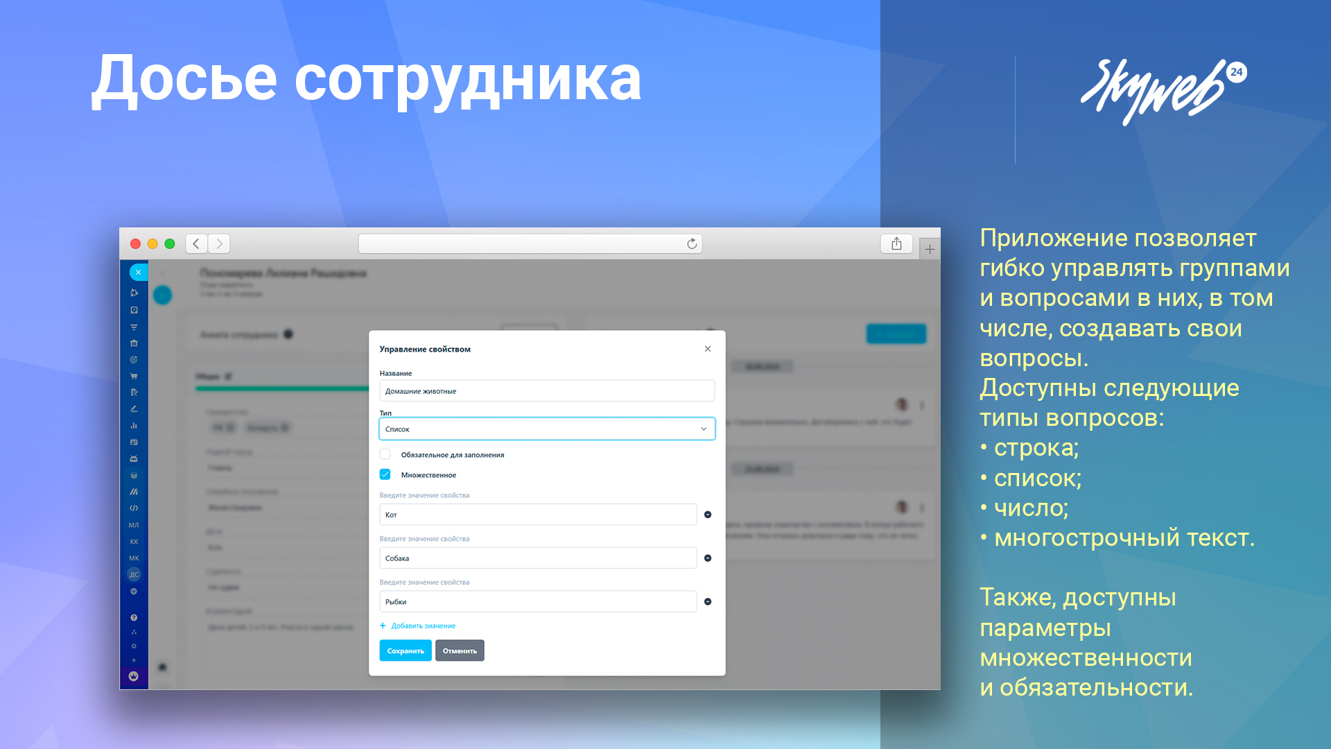 В стандартной CRM Битрикс24 нет удобного способа для записи и хранения информации о сотрудниках, а также, фиксации результатов коммуникаций. "Досье сотрудника" от Скайвеб24 решает эту проблему, предоставляя инструмент для создания и заполнения анкет сотрудников, что помогает лучше понять их сильные и слабые стороны и фиксировать важные моменты взаимодействий.