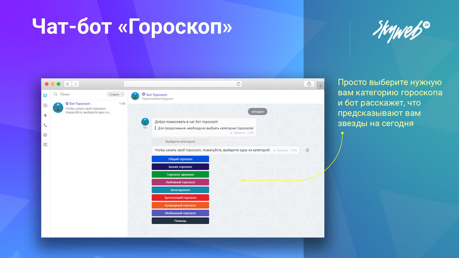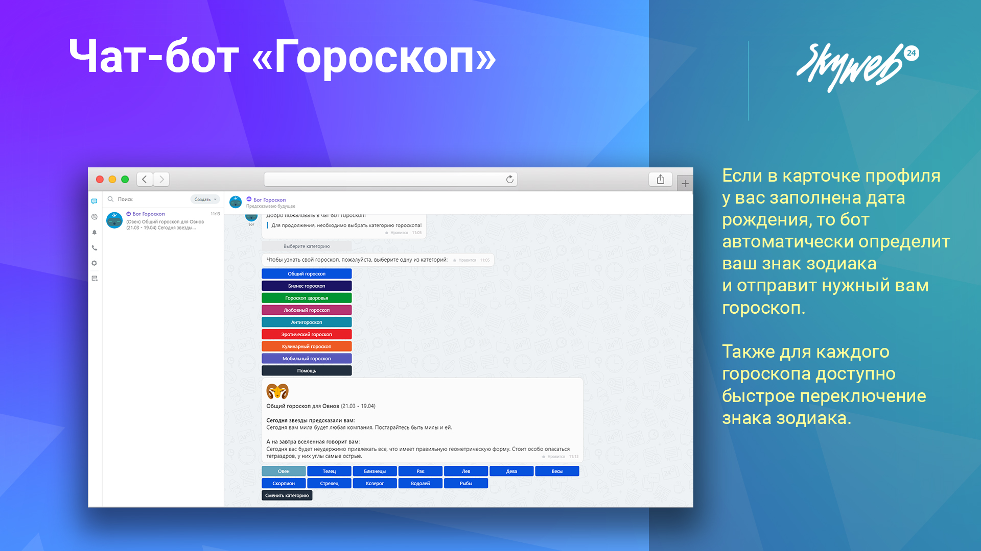 Гороскопы доступны прямо в чате вашего портала, что упрощает доступ к астрологическим прогнозам без необходимости установки дополнительных приложений.