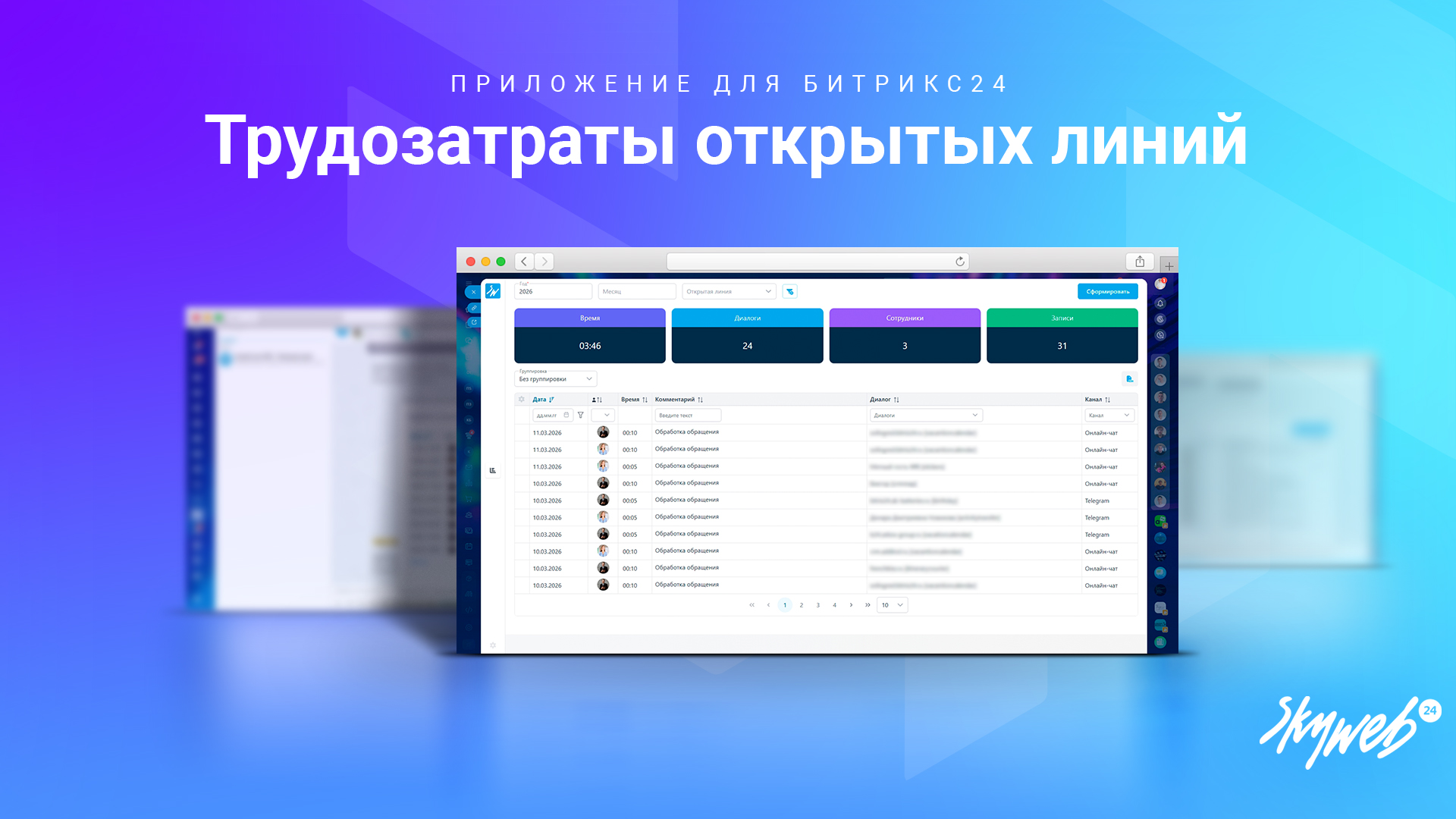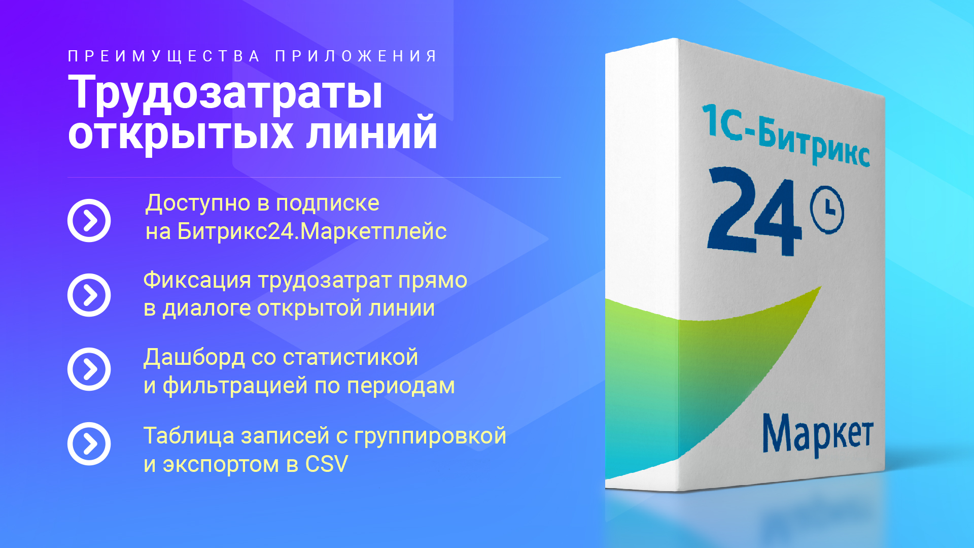 Приложение «Трудозатраты открытых линий» добавляет в интерфейс чата открытых линий удобный виджет для записи времени, затраченного на обработку диалогов. Все данные сохраняются в базе и доступны для анализа в отчётах и дашборде. Это первый инструмент, который даёт прозрачную картину трудозатрат сотрудников технической поддержки.