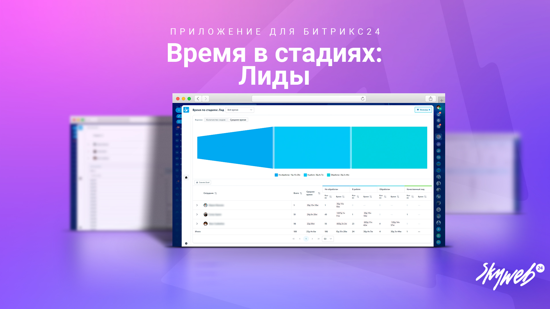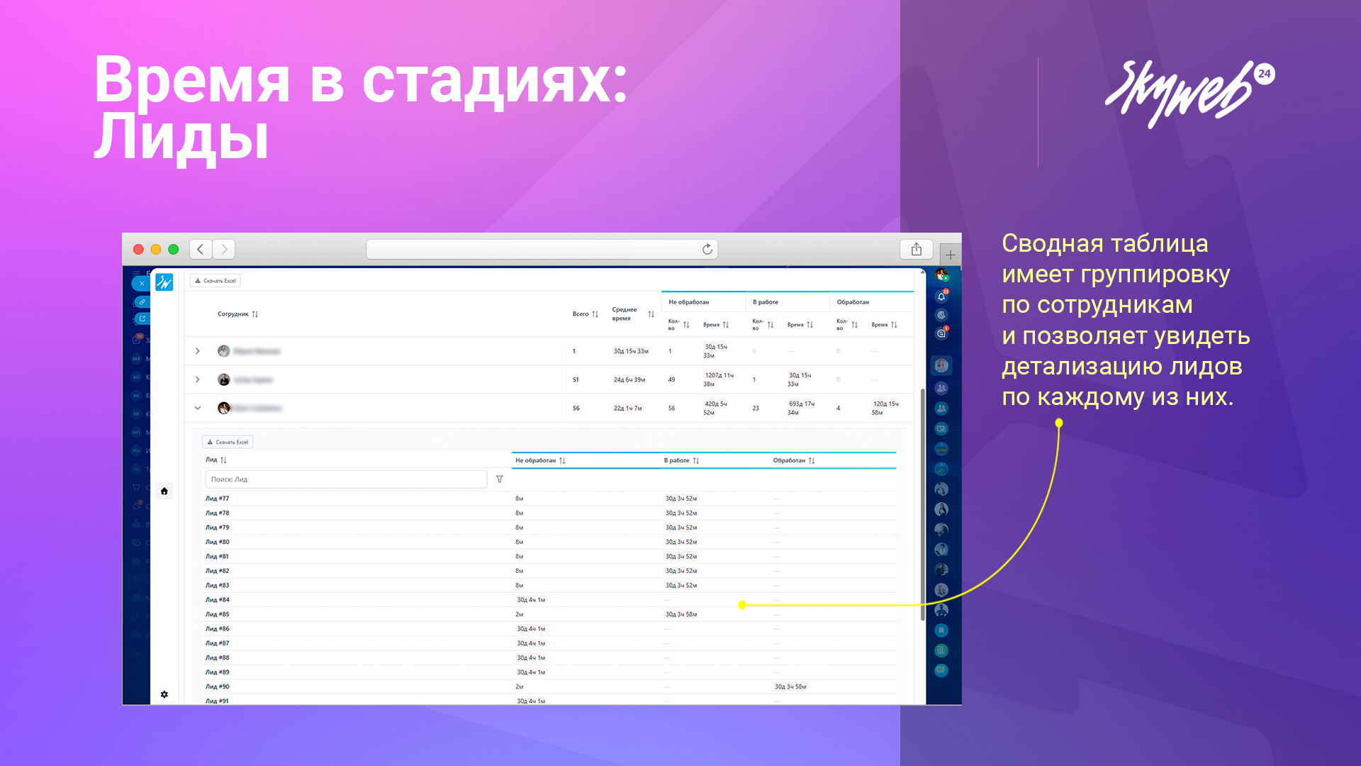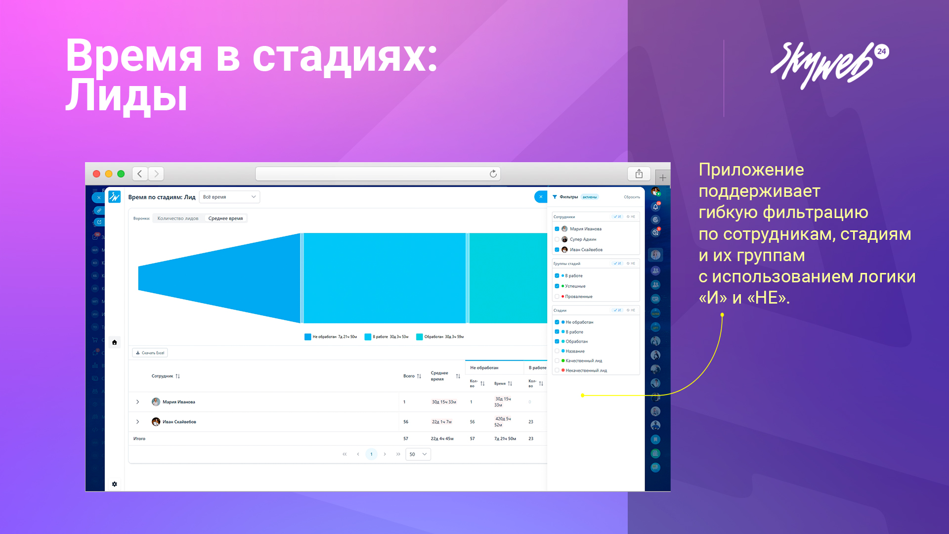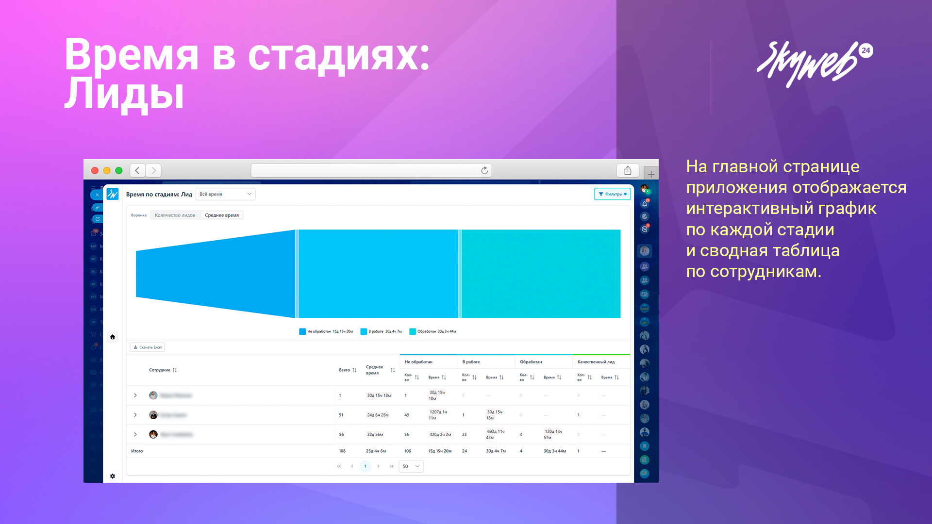 Автоматическое формирование таблицы с сотрудниками и стадиями, где видно количество лидов и суммарное время на каждой стадии.
