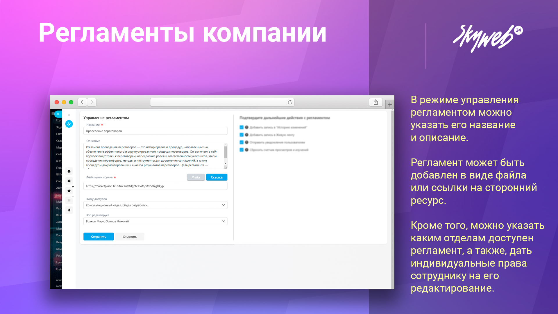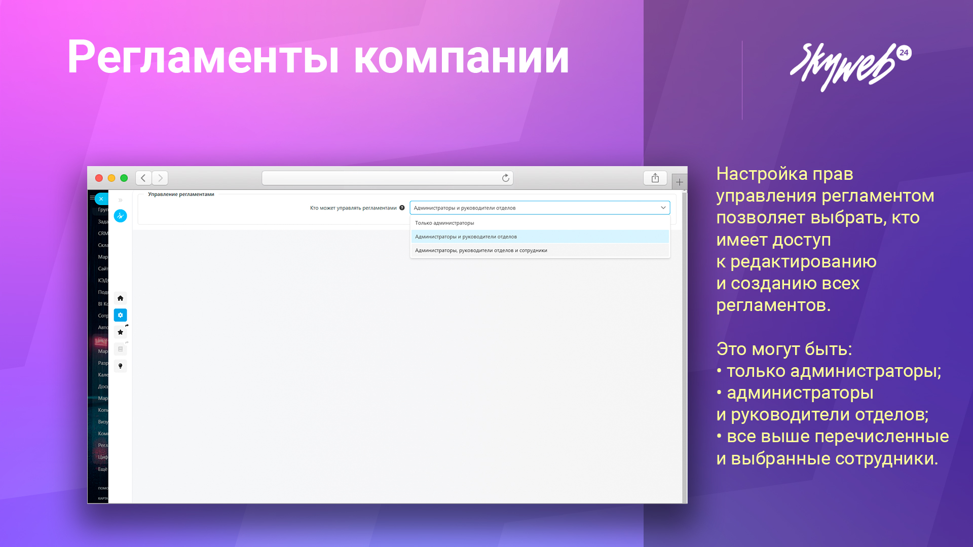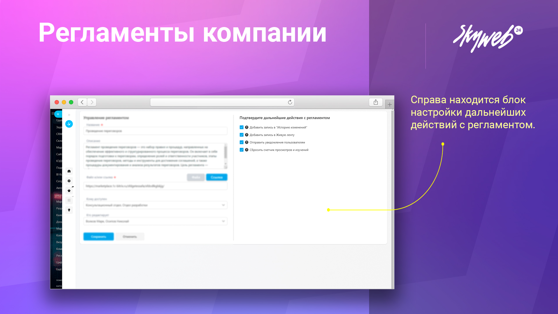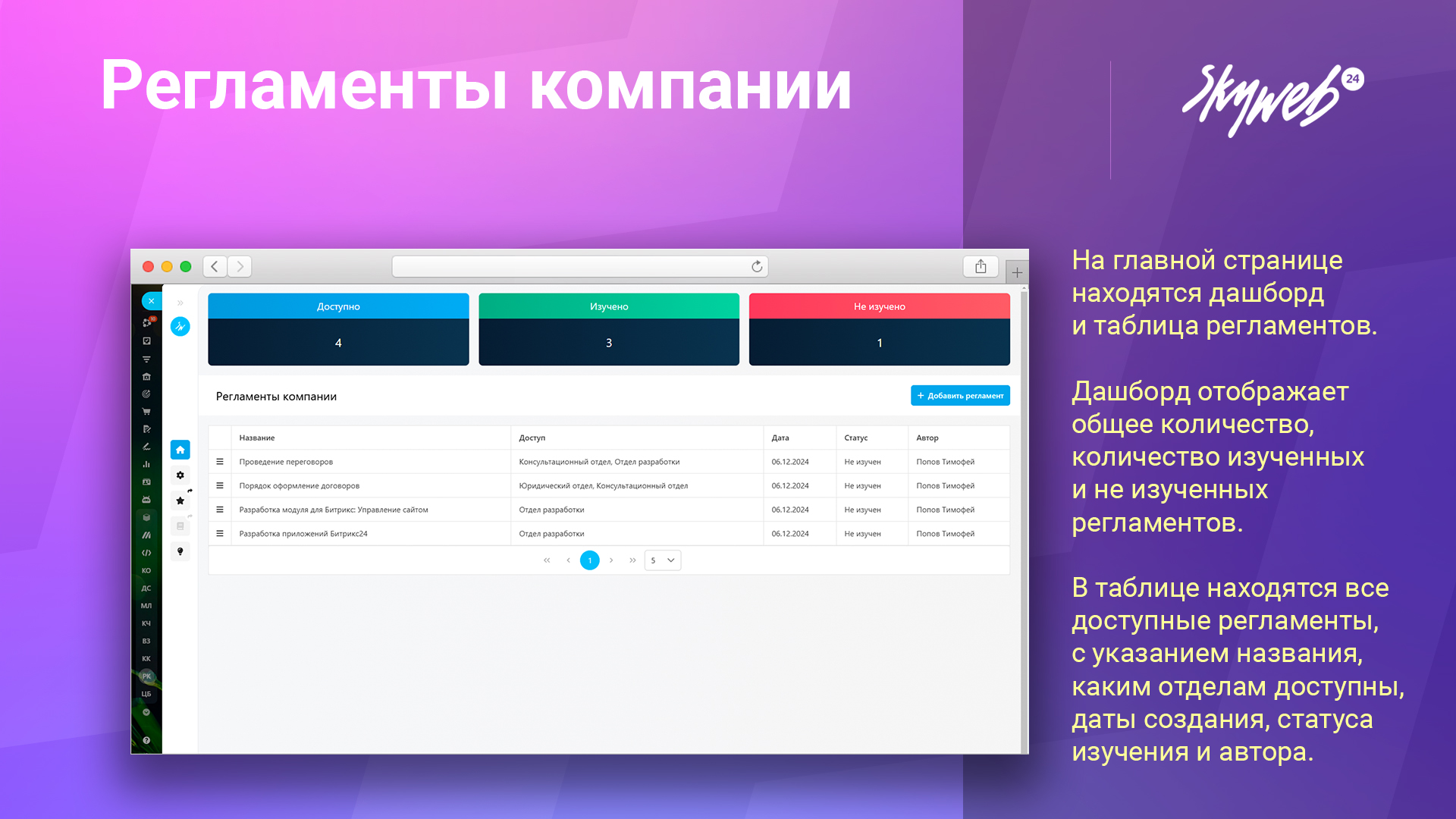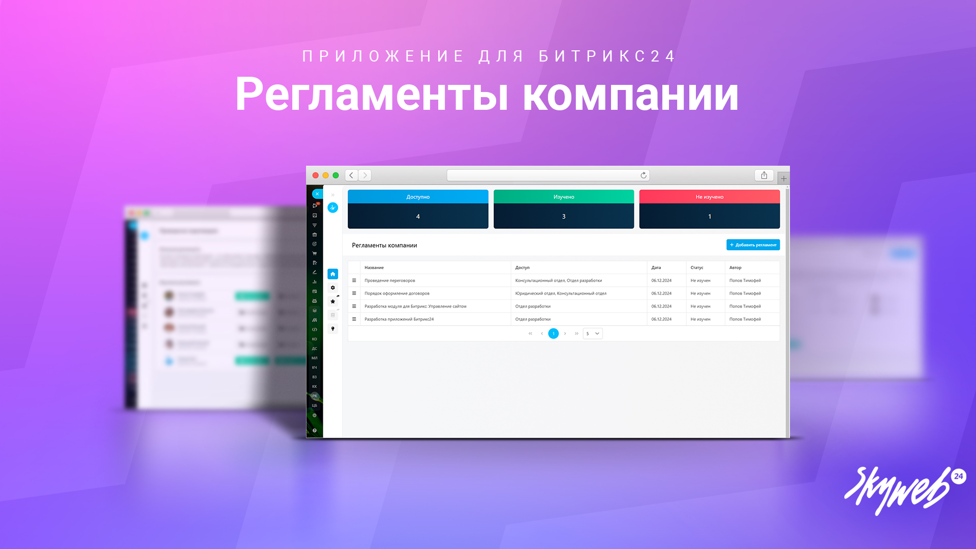 Сделайте управление внутренними документами простым и эффективным с приложением «Регламенты компании» от СкайВеб24. Повышайте стандарты работы и облегчайте доступ к важной информации уже сегодня!