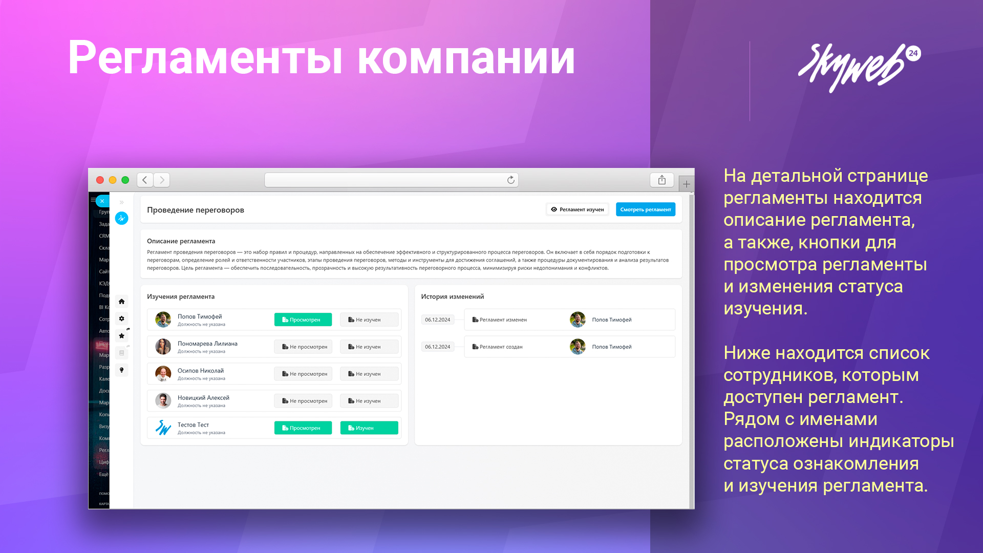 Просмотр и изучение регламента меняет статус в списке сотрудников, которым доступен регламент. Справа от списка располагается история изменения регламента.