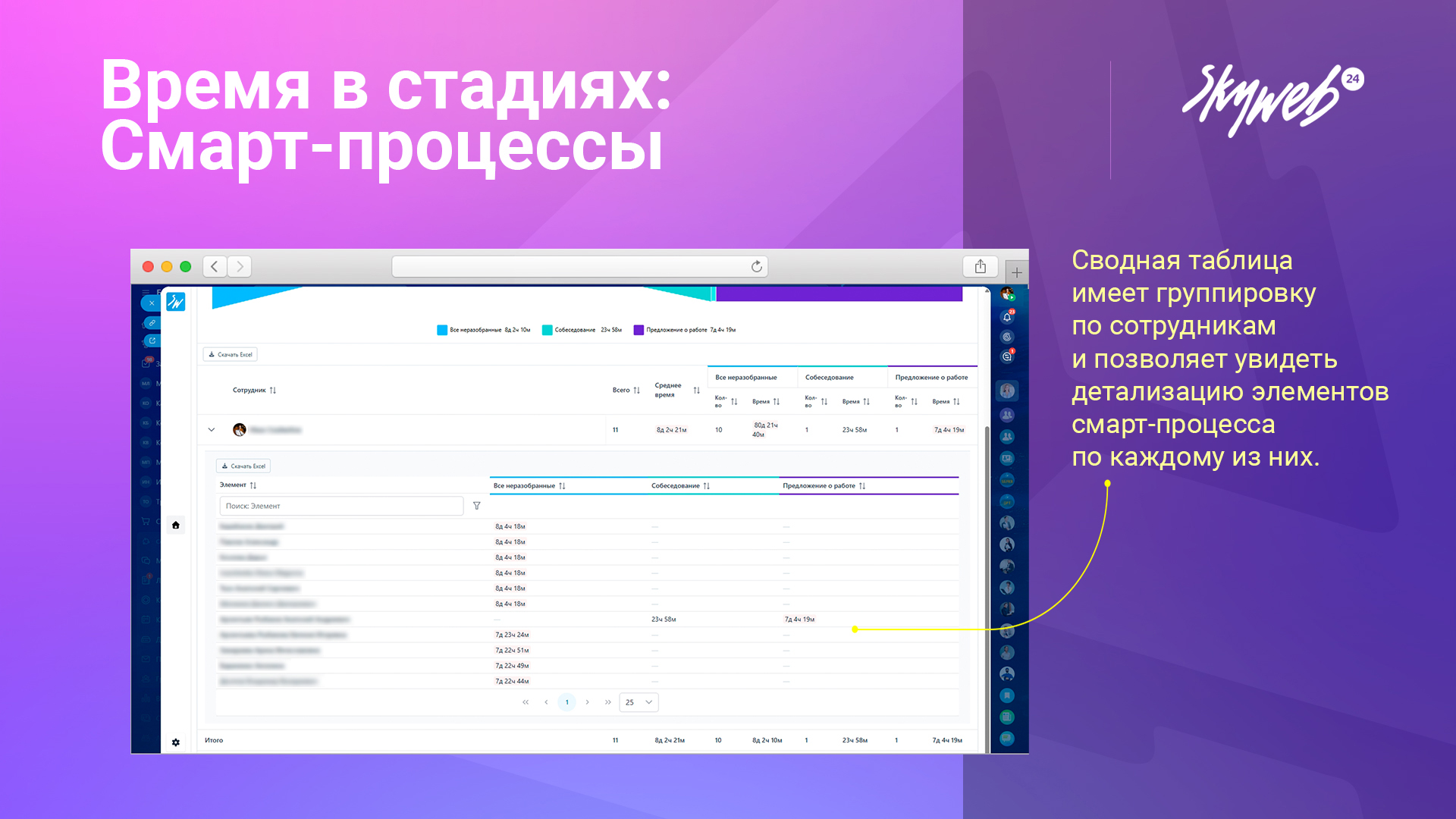 Автоматическое формирование таблицы с сотрудниками и стадиями, где видно количество элементов и суммарное время на каждой стадии.