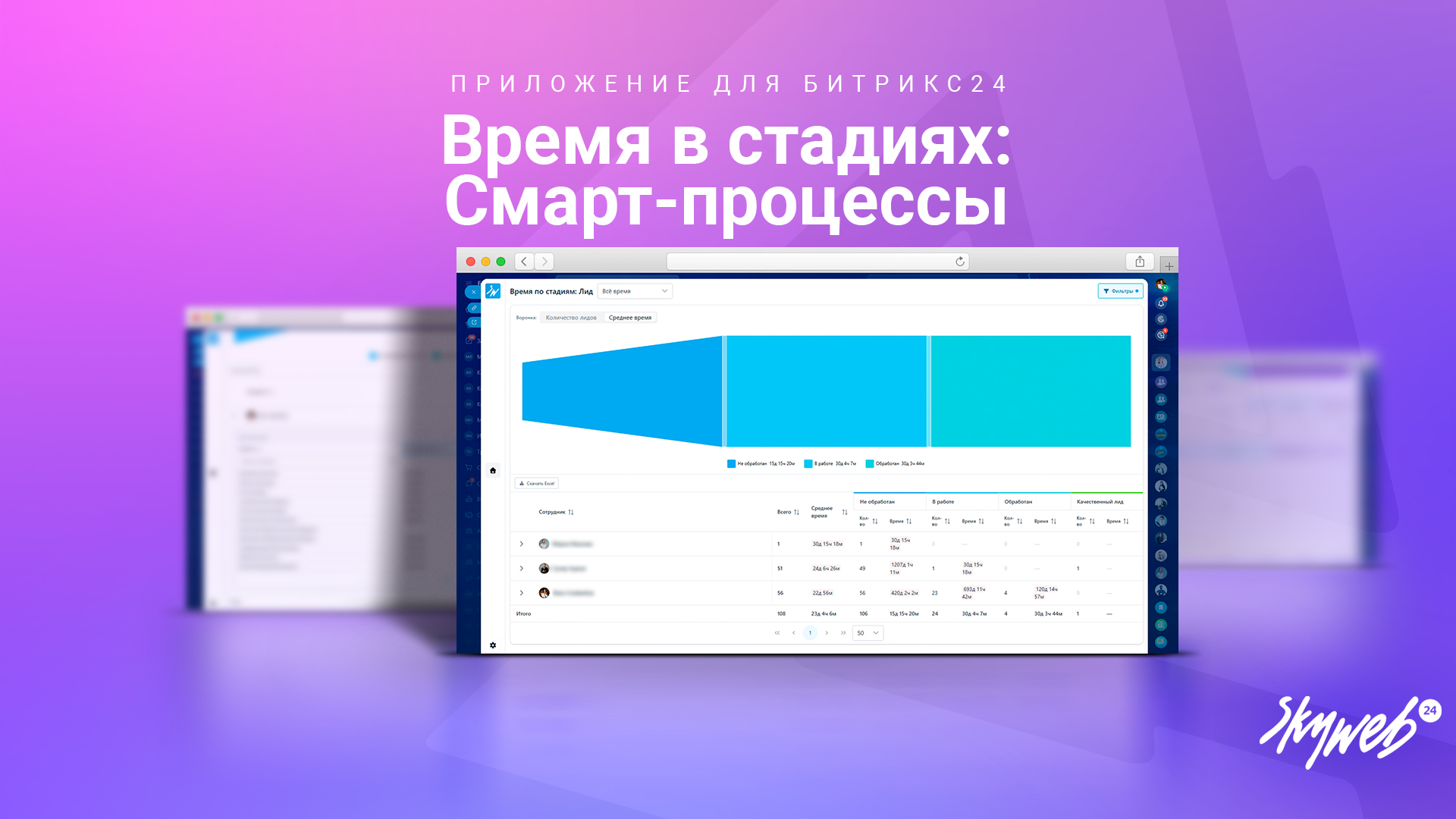 «Время смарт-процессов в стадиях с визуализацией» — это приложение для анализа времени нахождения элементов смарт‑процессов на стадиях. Оно формирует удобную таблицу, где строки — сотрудники, а столбцы — стадии выбранного процесса и выбранной воронки. В каждой ячейке отображается количество элементов и суммарное время, проведённое на стадии. При раскрытии таблицы можно перейти к деталям по каждому конкретному элементу. Такой подход позволяет быстро выявлять узкие места, контролировать скорость работы команды и оптимизировать бизнес‑процессы.
