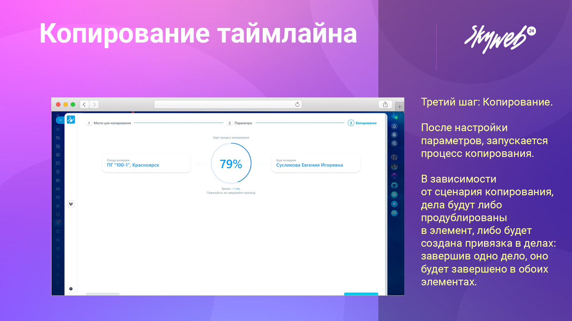 «Копирование таймлайна» переносит все дела из одного CRM‑элемента в другой. Вы сами выбираете, какие дела копировать, и как именно: создать дубликаты или связать элементы так, чтобы изменения отражались сразу в обоих. Поддерживаются все стандартные сущности и вложения.