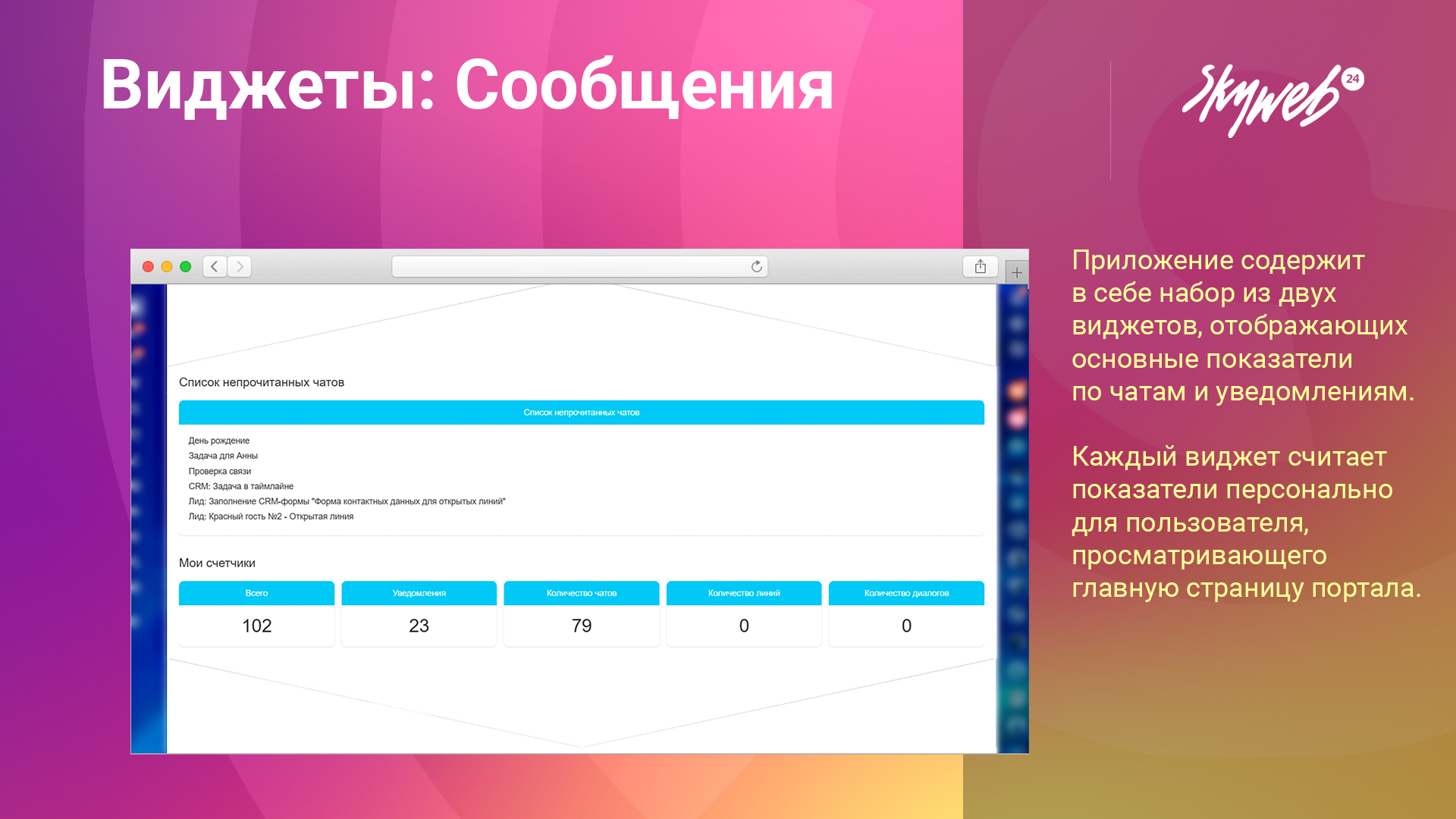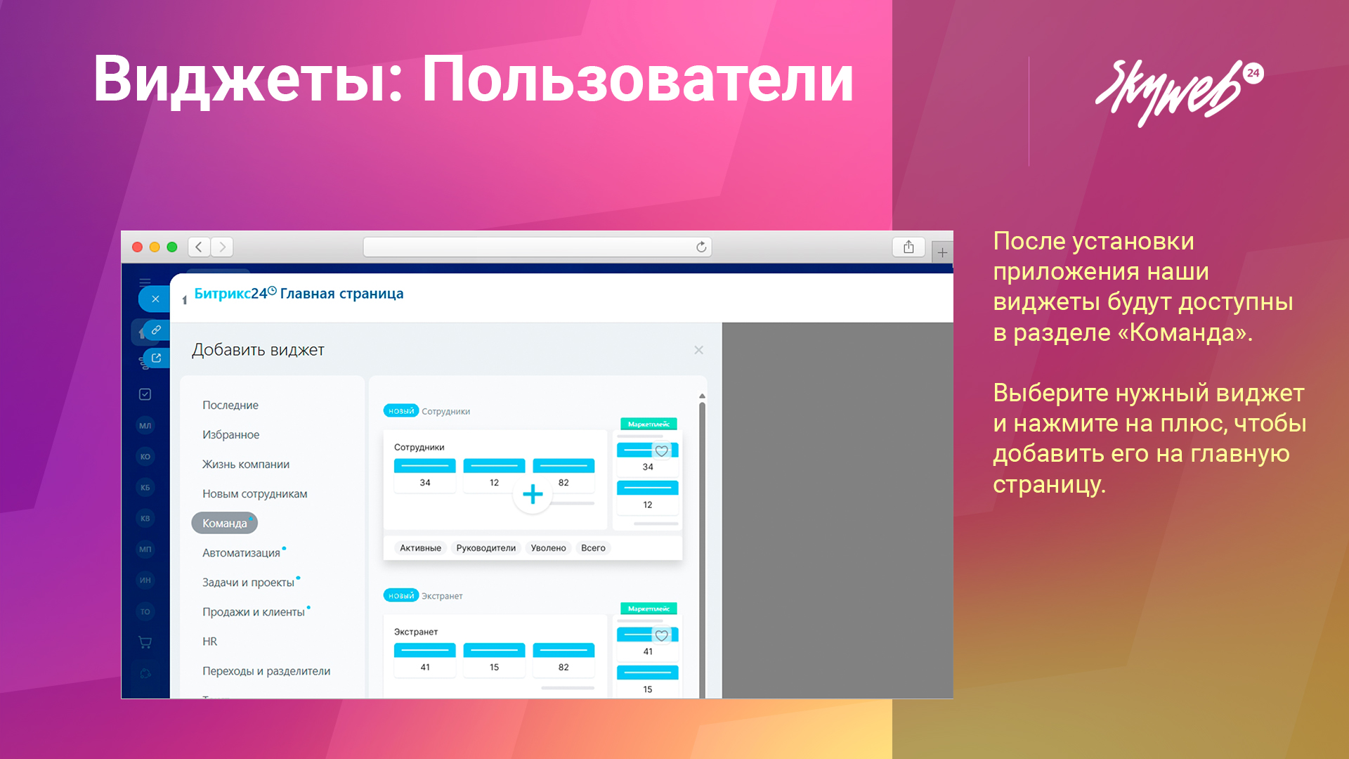 Наше приложение добавляет удобные виджеты на главную страницу Битрикс24, позволяя отслеживать ключевые данные о пользователях портала.