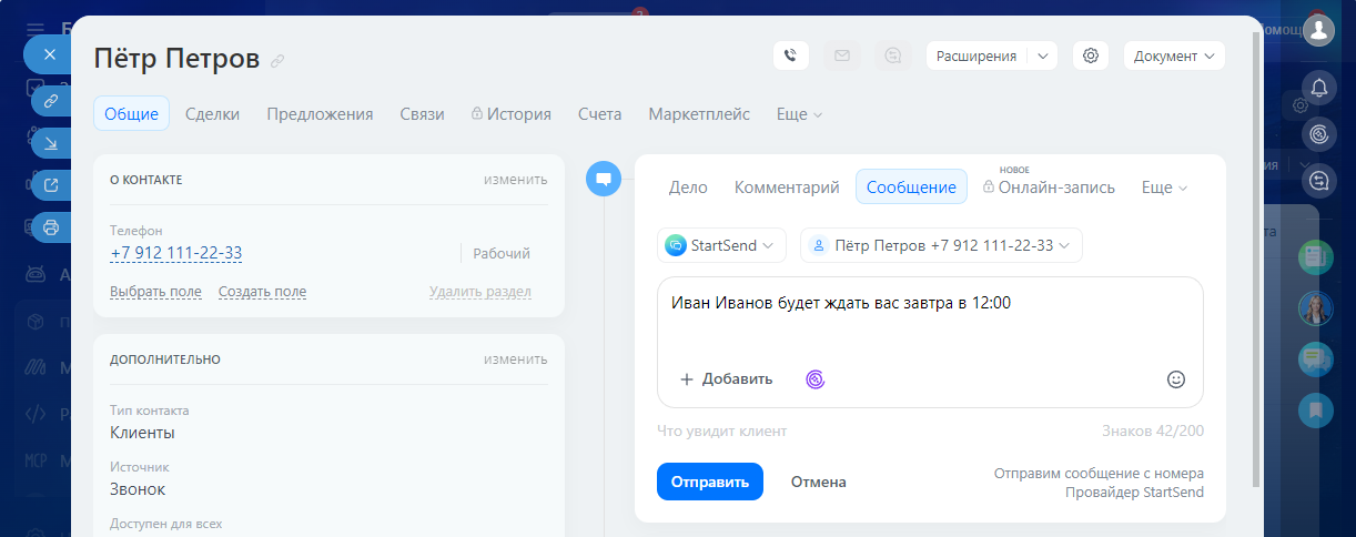 Приложение интегрируется с порталом Битрикс24, позволяя делать отправки SMS по вашим контактам прямо из портала Битрикс24.